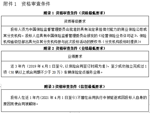 3.1投标人须为中国保险监督管理委员会批准的具有法定承担偿付能力的商业保险公司或其分支机构。投标人应具有中国保险监督管理委员会颁发的《经营保险业务许可证》、保险机构省级总部出具允许其分支机构参与此次投标活动的授权书(分支机构投标时提供);近3年内(2019年4月1日至今,以保险合同签订时间为准)至少成功独立完成过1项(50辆以上或合同额不少于20万)车辆保险定点服务业绩。