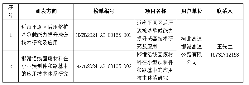 根据集团公司《科技创新项目“揭榜挂帅”实施办法(试行)》冀高创〔2023〕594 号的要求,现发布“近海平原区后压浆桩基承载能力提升成套技术研究及应用”及“邯港沿线固废材料在小型预制件和路基中的应用技术体系研究”两个科技创新项目“揭榜挂帅”榜单,面向国内外高校、科研机构、科技型企业或其组成的联合体开展揭榜攻关,有关事项公告如下: