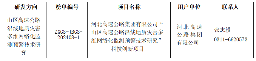 根据集团公司《关于印发<科技创新项目“揭榜挂帅 ”实施办法(试行)> 的通知》冀高创〔2023〕594 号的要求,现发布“山区高速公路沿线地质灾害多维网络化监测预警技术研究”科技创新项目“揭榜挂帅 ”榜单,面向国内外高校、科研机构、科技型企业或其组成的联合体开展揭榜攻关,有关事项公告如下: