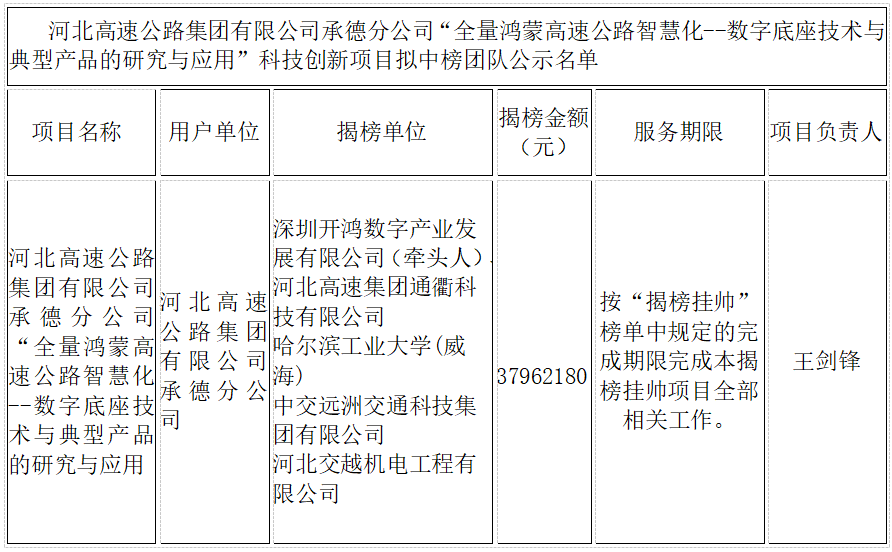 根据开云集团《关于印发〈科技创新项目“揭榜挂帅”实施办法(试行)》的通知〉冀高创〔2023〕594号,现将“开云集团承德分公司‘全量鸿蒙高速公路智慧化--数字底座技术与典型产品的研究与应用’科技创新项目”揭榜挂帅拟中榜团队名单进行公示。如有异议,请在公示期内将意见书面反馈至代理机构。
