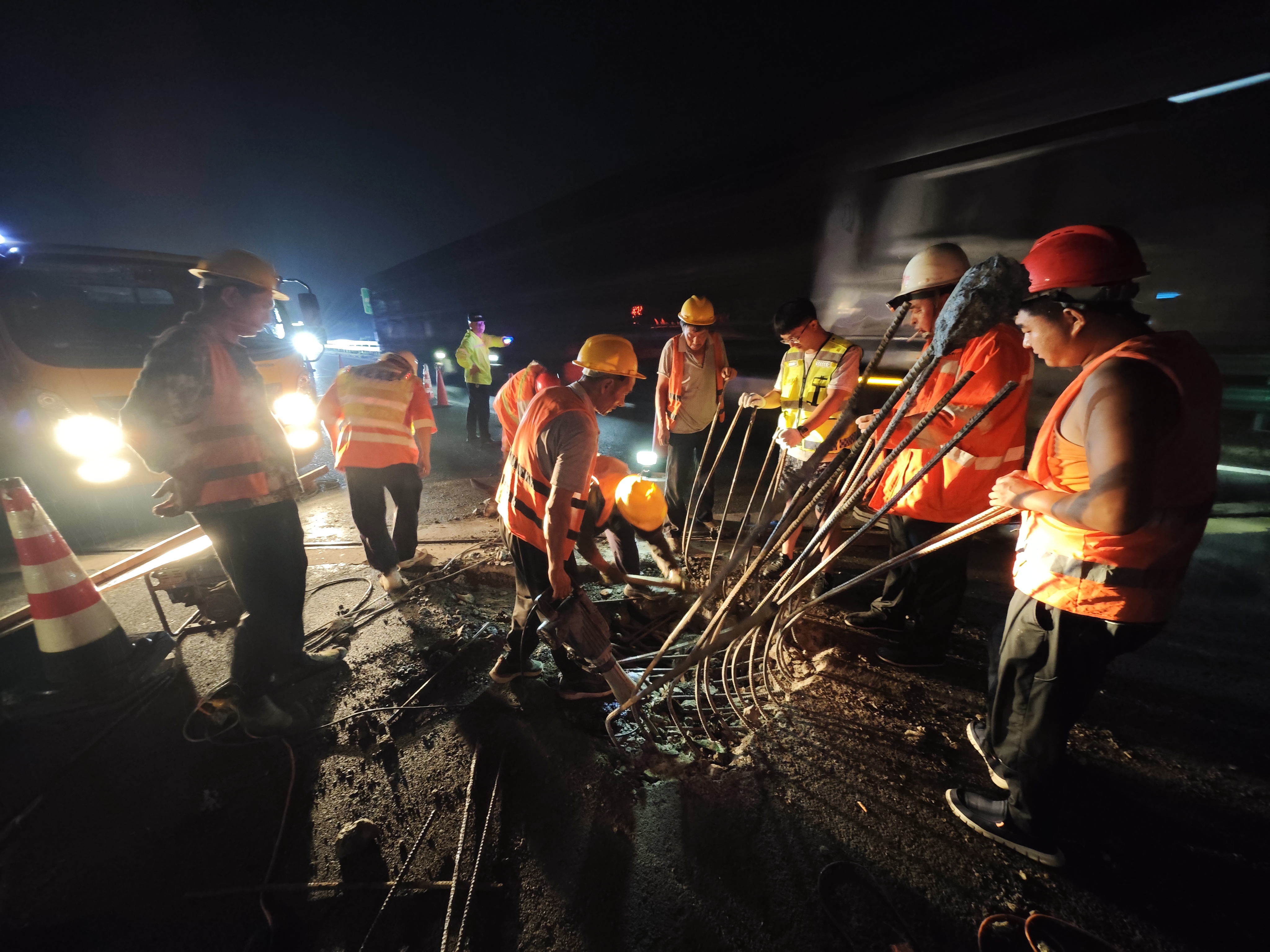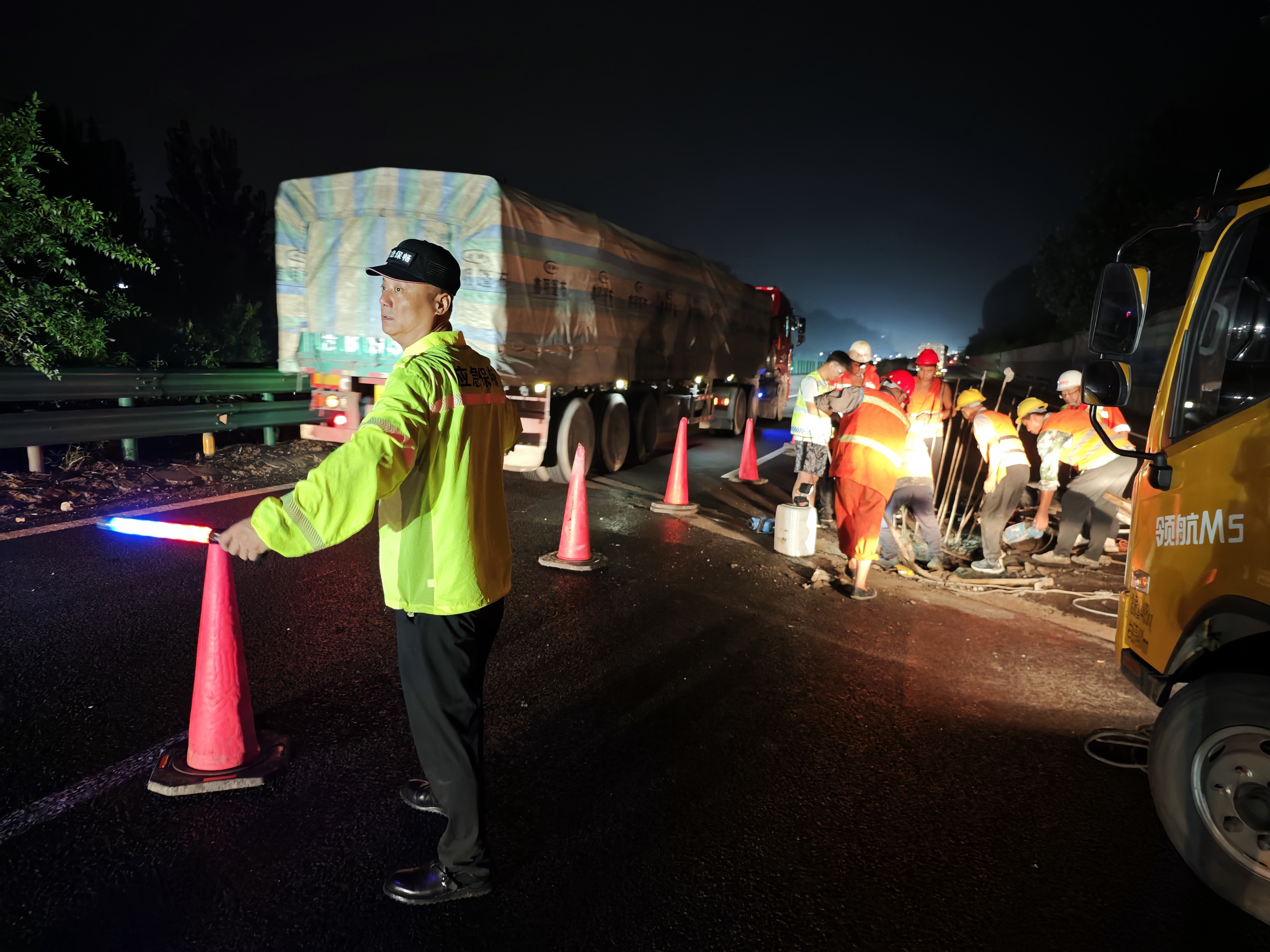 专项中队长赵乘卫接到通知后从家中赶到现场提供技术指导。此时正值夜间,视线差且有零星降雨,仅剩一条车道通行,疏导车辆面临巨大挑战。全体队员身穿发光背心,手持闪光红蓝指挥棒,不间断引导车辆有序通过。夜间数次车流高峰,现场人员统一指挥、快速反应,临时放开应急车道,精准引导车辆快速通行。副大队长刘林和外业中队长赵川润勇于担当,组织换班值守,防止人员疲劳引发安全事故,一直坚持到抢修结束。