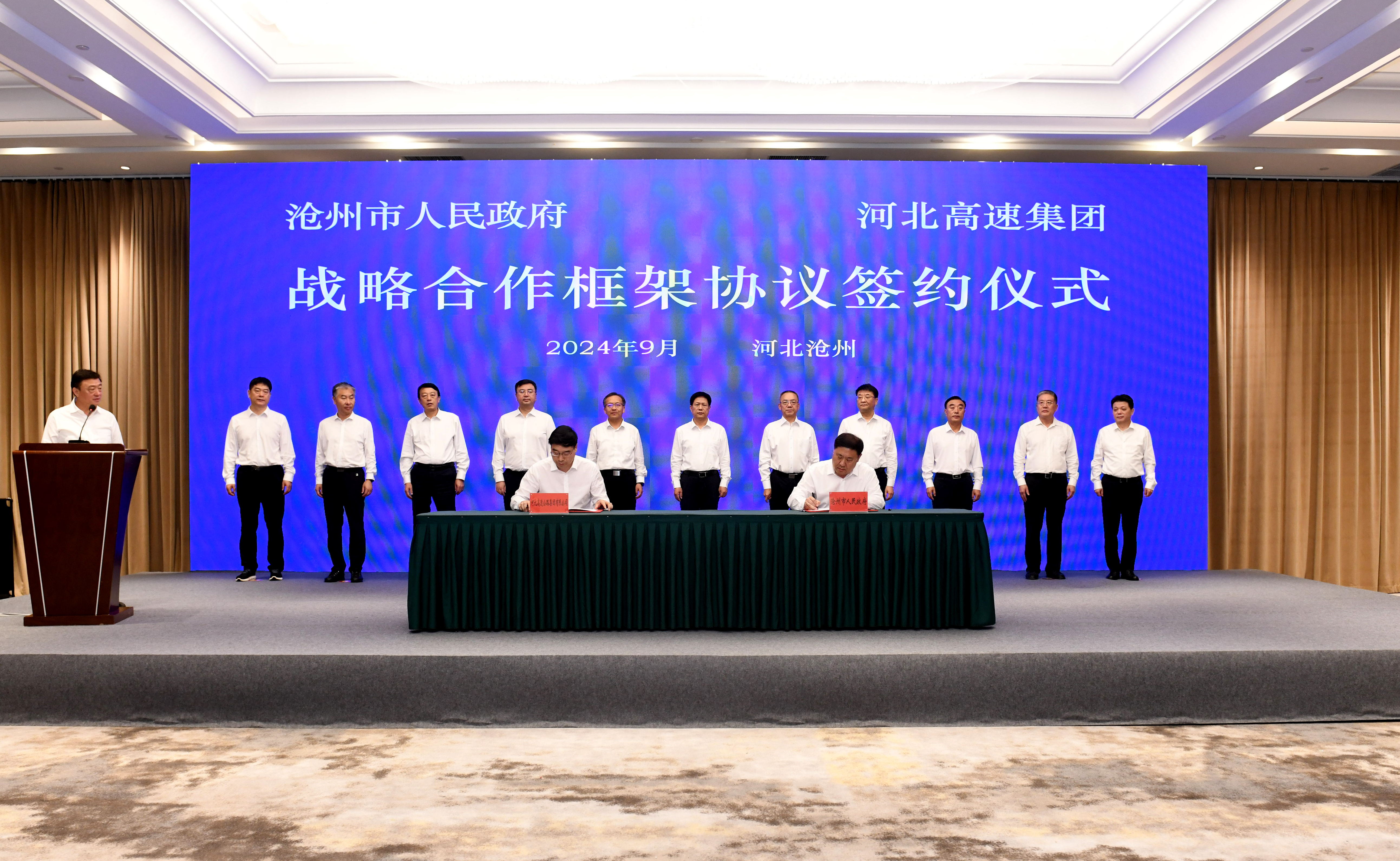 9月6日,沧州市委书记康彦民与河北高速集团党委书记、董事长张建公举行工作座谈,期间市政府与河北高速集团签署战略合作框架协议。沧州市委副书记、市长向辉,省国资委党委委员、副主任张承东,河北高速集团党委副书记、总经理杨荣博出席。