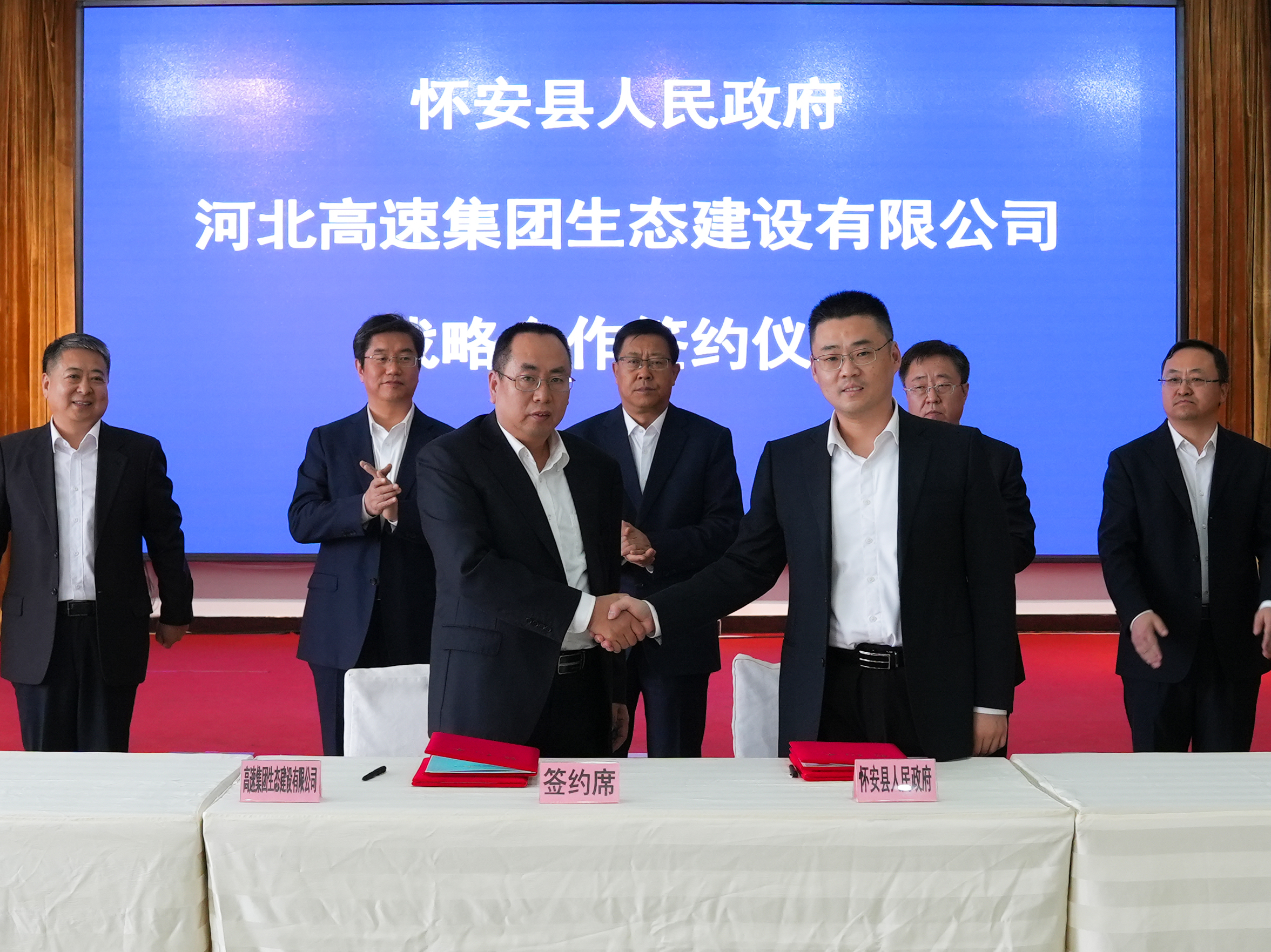 10月25日,河北高速集团生态建设有限公司与怀安县人民政府在怀安县宾馆举行了战略合作签约仪式。张家口市政协党组书记、主席高峰,张家口市人大副主任孙海东,河北高速集团党委副书记、董事、工会主席董广,张家口怀安县县委书记刘源,生态建设公司党支部书记、董事马明玉出席签约仪式。怀安县县长孙少凯与生态建设公司总经理焦银禾分别代表双方签署了《战略合作框架协议》及《土地整治(占补平衡)项目合作协议》。怀安县副县长高志宏主持签约仪式。