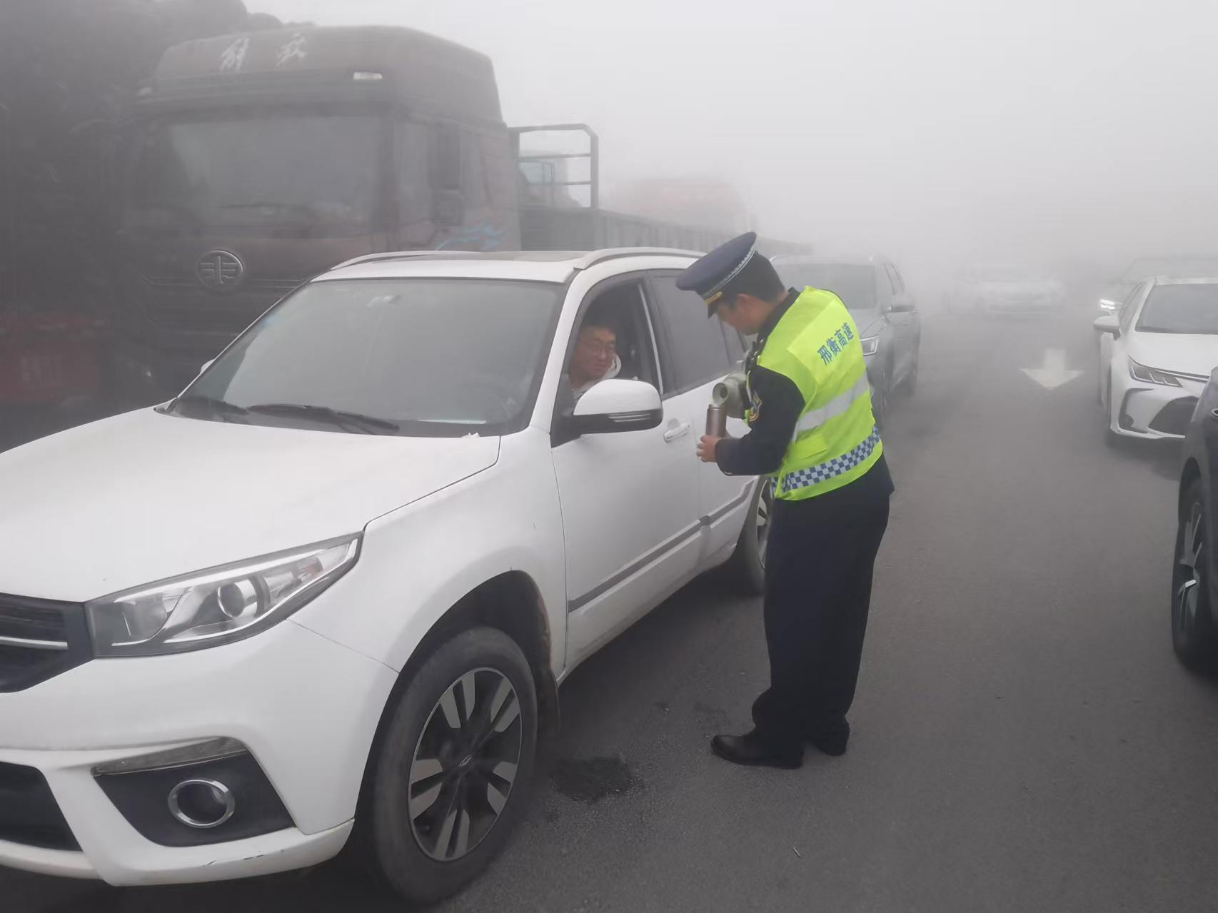冀州西收费站用热情和耐心为滞留人员提供了周到的服务,保障了大雾天气下收费站区域的稳定和安全,受到了滞留司机们的一致好评,彰显了河北高速的社会责任担当。(王金鹏)