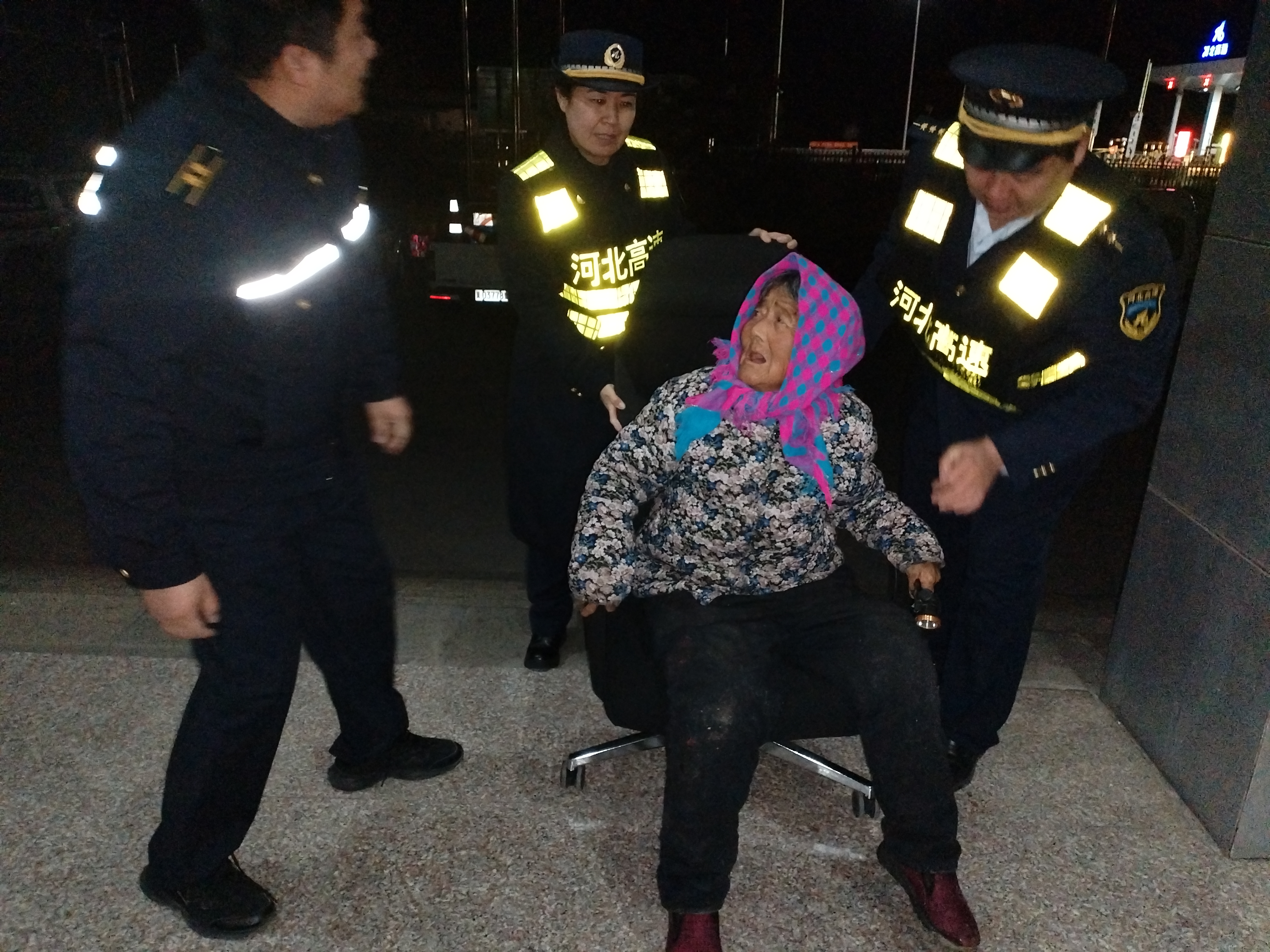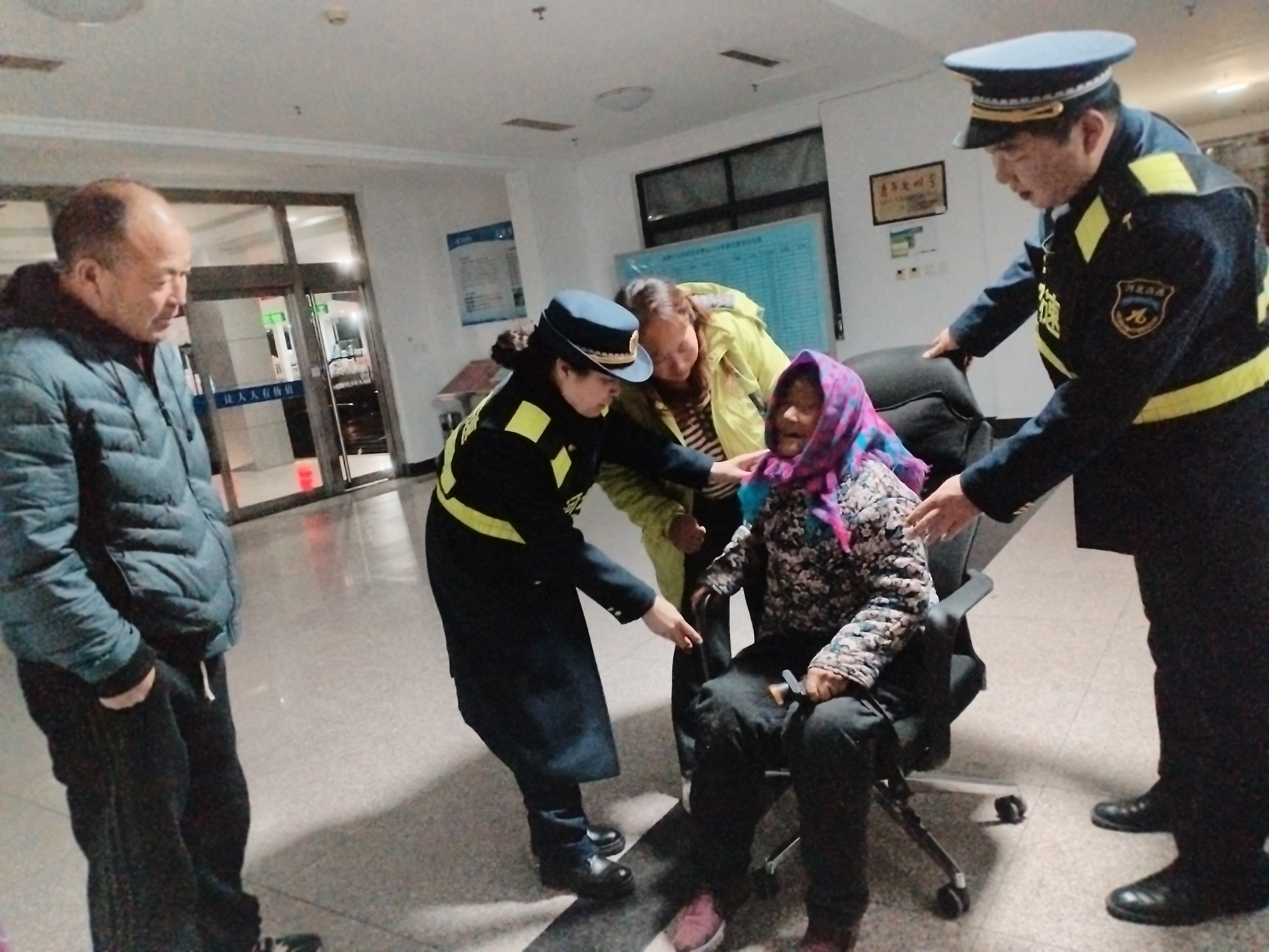 11月18日晚21点10分,安匠收费站正在前勤值班的三班班长杜云飞发现收费广场有位老人蹒跚走来,由于车道来往车多杜云飞赶紧跑过去搀扶老人到路边,当时老人又累又冷,体力不支,杜云飞见状马上让当班收费员朱晓玲搬来椅子让老人坐下,从服务台给老人倒一杯热水,同时向站长汇报情况。