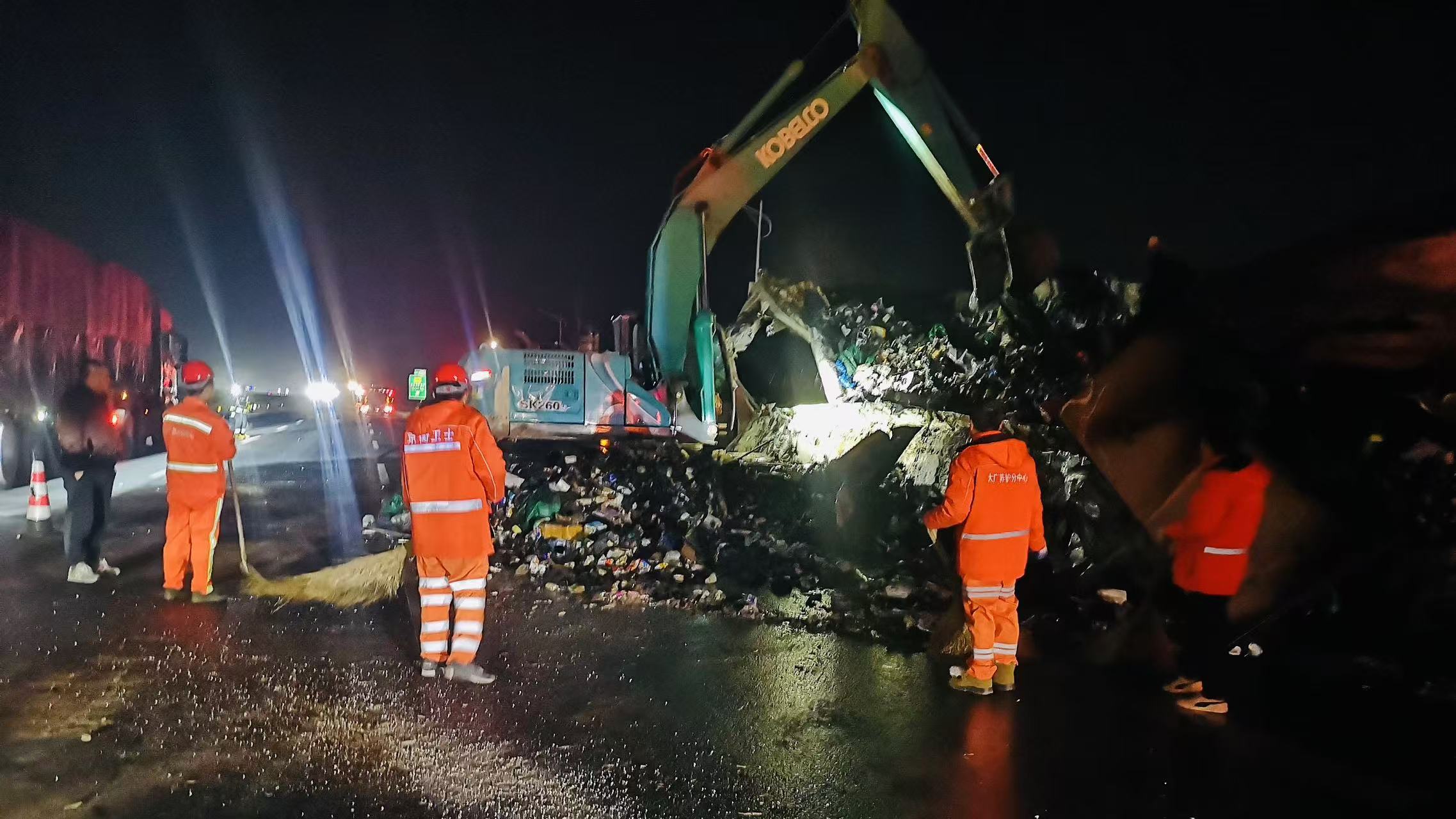 到达现场后,养护人员协助高速交警、消防救援人员对现场进行了封控和应急处置。直至晚19时,车辆起火全部扑灭后,养护人员又立即投入现场洒落物和垃圾情况工作中,养护人员顶着寒风和刺鼻气味,使用装载机、铁锹对车道进行快速清理。同时,为防止路面结冰,养护人员预防性撒布融雪剂,确保车辆通行安全。