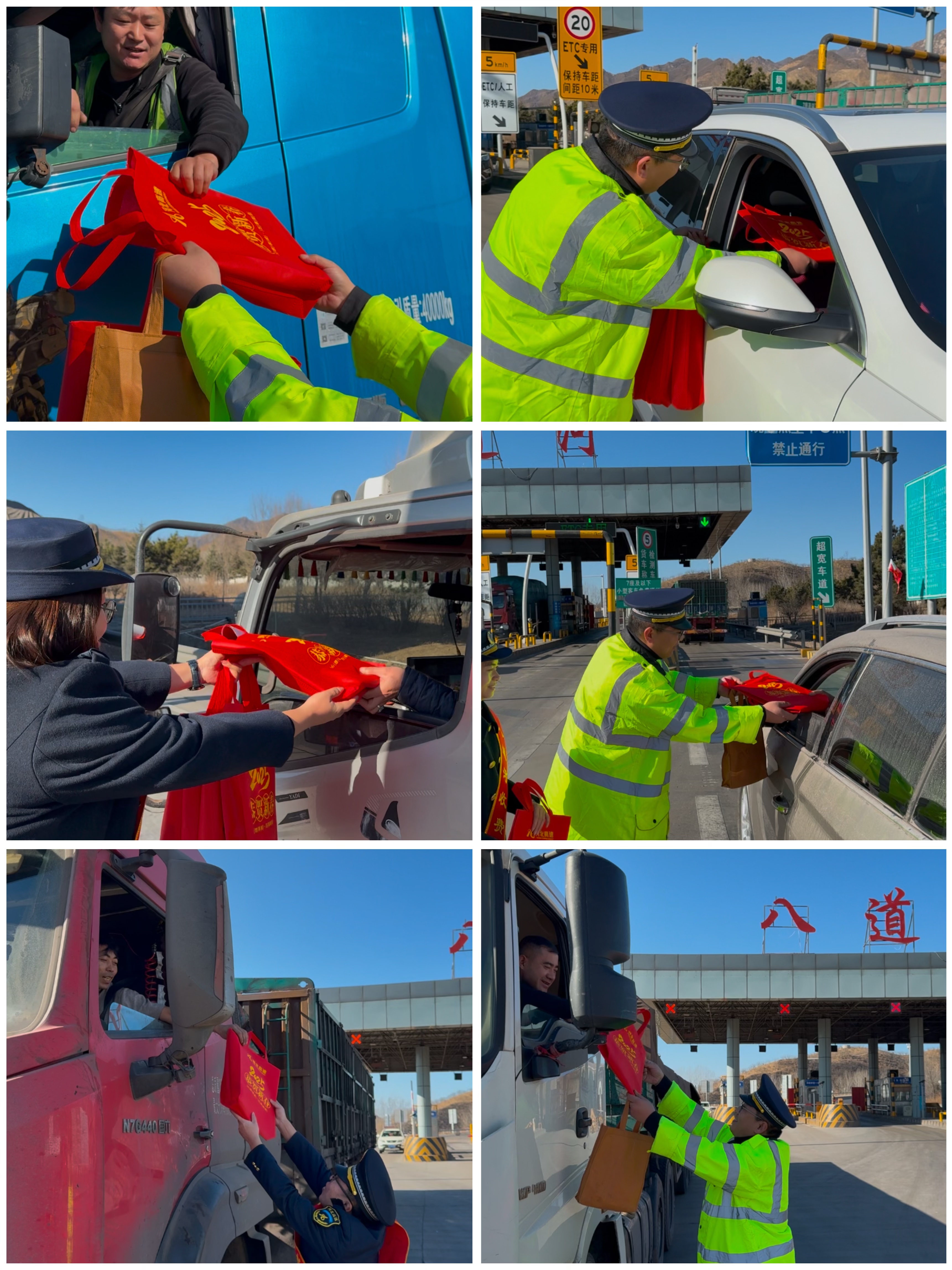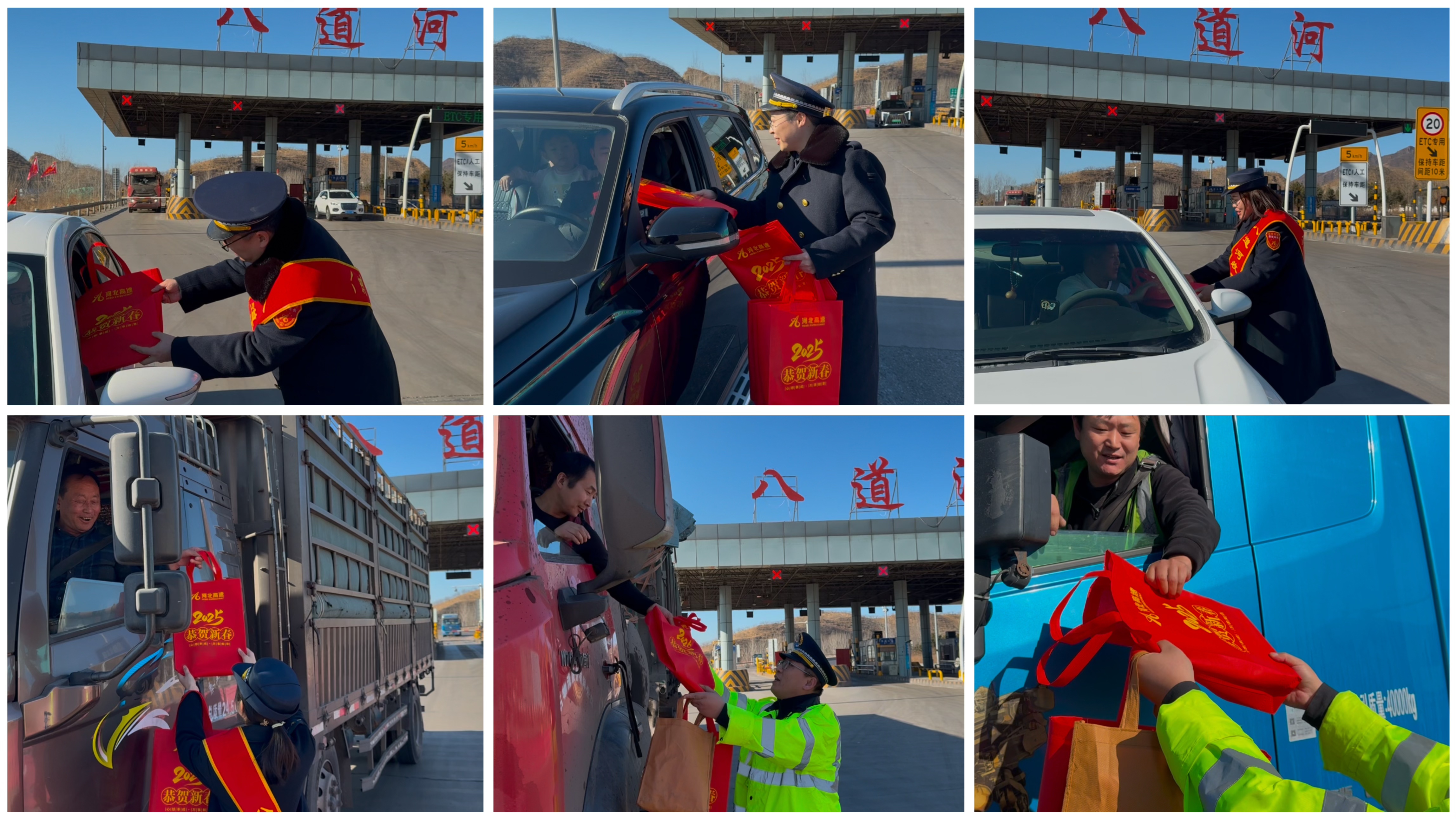 “河北高速祝您新春愉快,阖家欢乐,一路平安。”职工们将大礼包送到过往司乘人员手中,表达对“家人”的新春祝福,一句暖心的祝福,一句真诚的问候,汇聚成浓浓的新春祝福,传递着新年的欢乐与喜悦,让奔波在外的“家人”感受到家的温暖,体验八道河收费站的别样“年味”。
