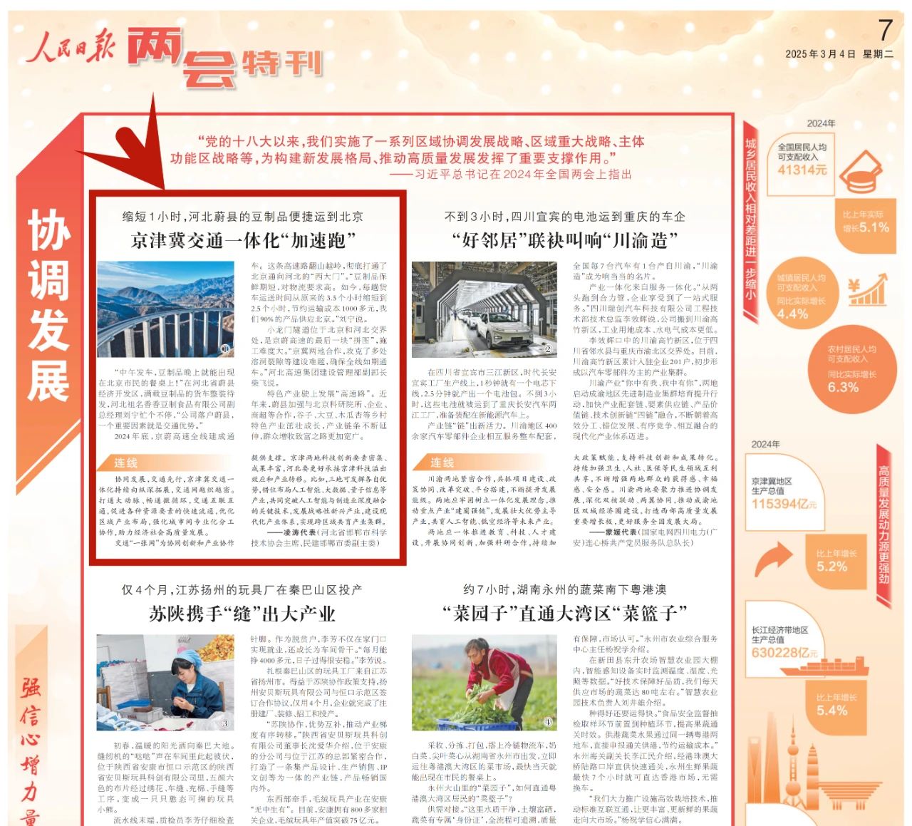 3月4日,《人民日报》两会特刊对京蔚高速通车助力京津冀交通一体化持续向纵深拓展相关情况进行报道。
