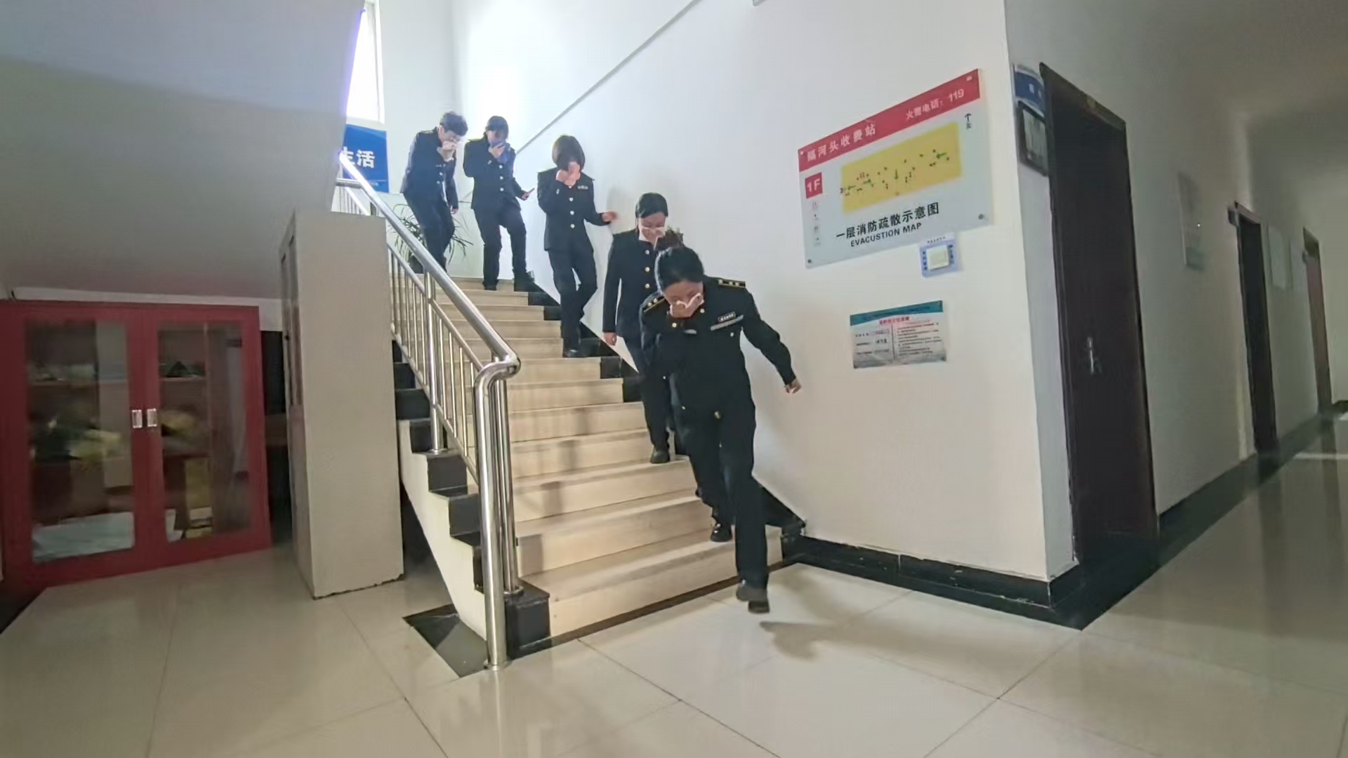 随着站长一声令下,模拟火情警报在收费站骤然响起,全体职工迅速启动应急预案,按照“掩住口鼻、低姿扶墙”的逃生要领,沿预设疏散通道快速撤离至安全区域。结束后,站长强调:“疏散演练不是‘走过场’,必须做到路线清、动作准、反应快!”