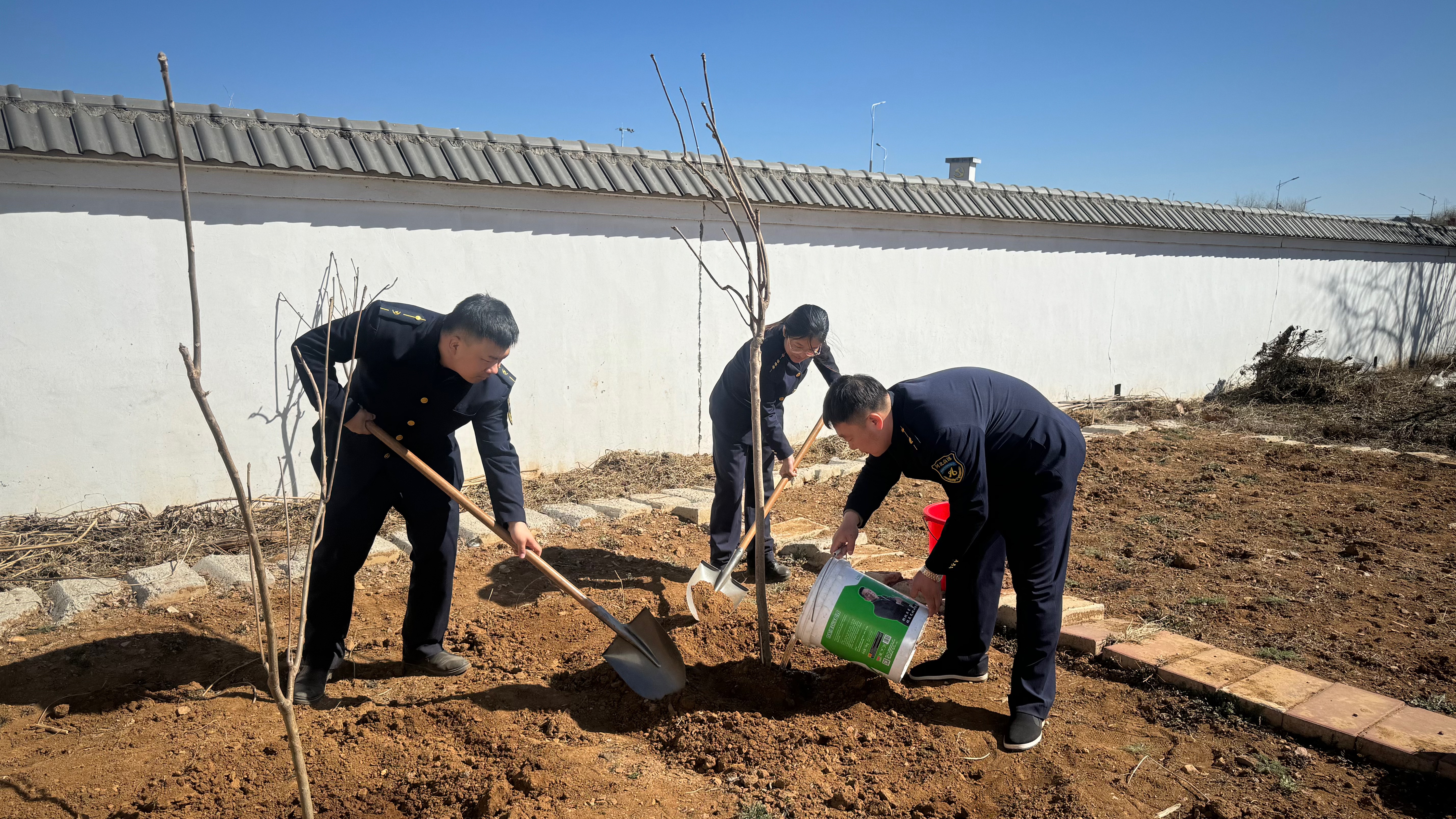 植树现场,志愿者们分工协作,默契配合。有人挥锹铲土,有人扶苗对齐,还有人提水浇灌,经过一个多小时的努力,8颗树苗全部种植完毕。一颗颗树苗昂然挺立,错落有致,在和煦的春风里显露勃勃生机。