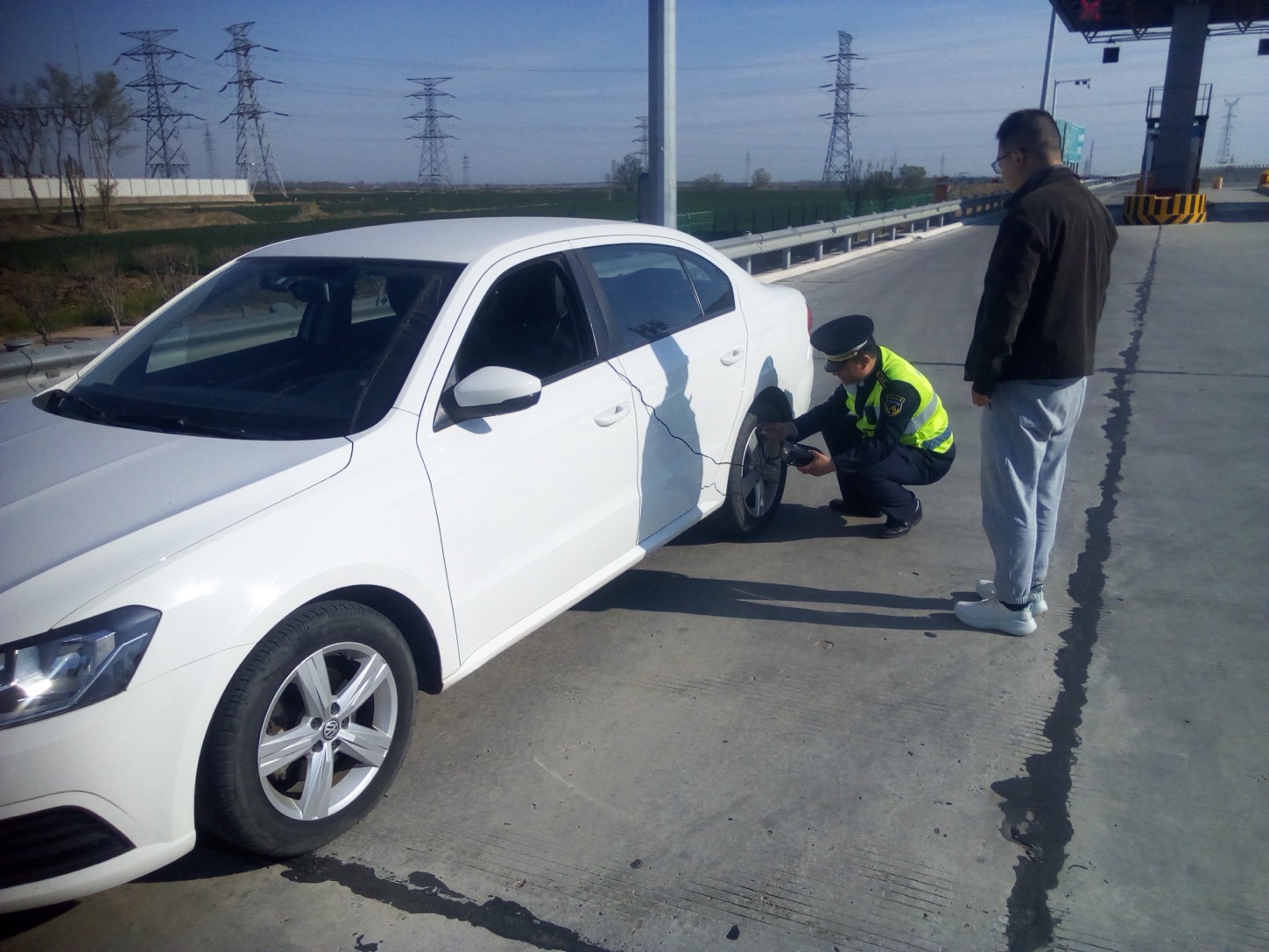 4月13日,一辆小轿车缓慢驶入冀州西收费站106车道,到达收费窗口时司机说道:“请问你们附近有没有补胎的地方啊,我在高速上突然胎压监测就报警了,可能是轮胎没气了,就近赶紧下了高速。”收费员立即将情况报告给班长。