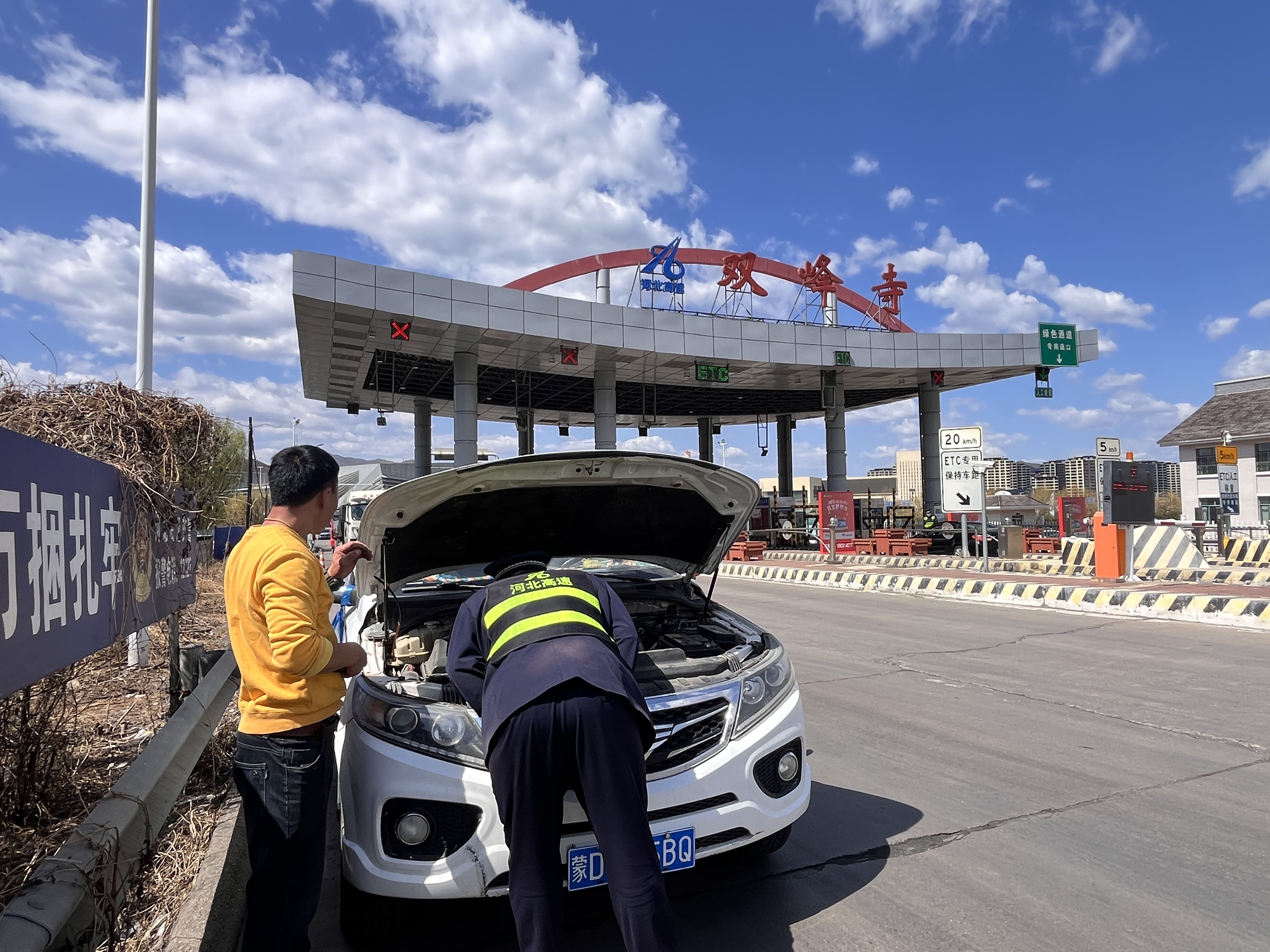 4月19日13时许,在双峰寺收费站入口广场,一辆蒙D牌照白色轿车完成取卡驶入高速后突然熄火且无法启动。面对突发状况,车主焦急万分,手足无措。