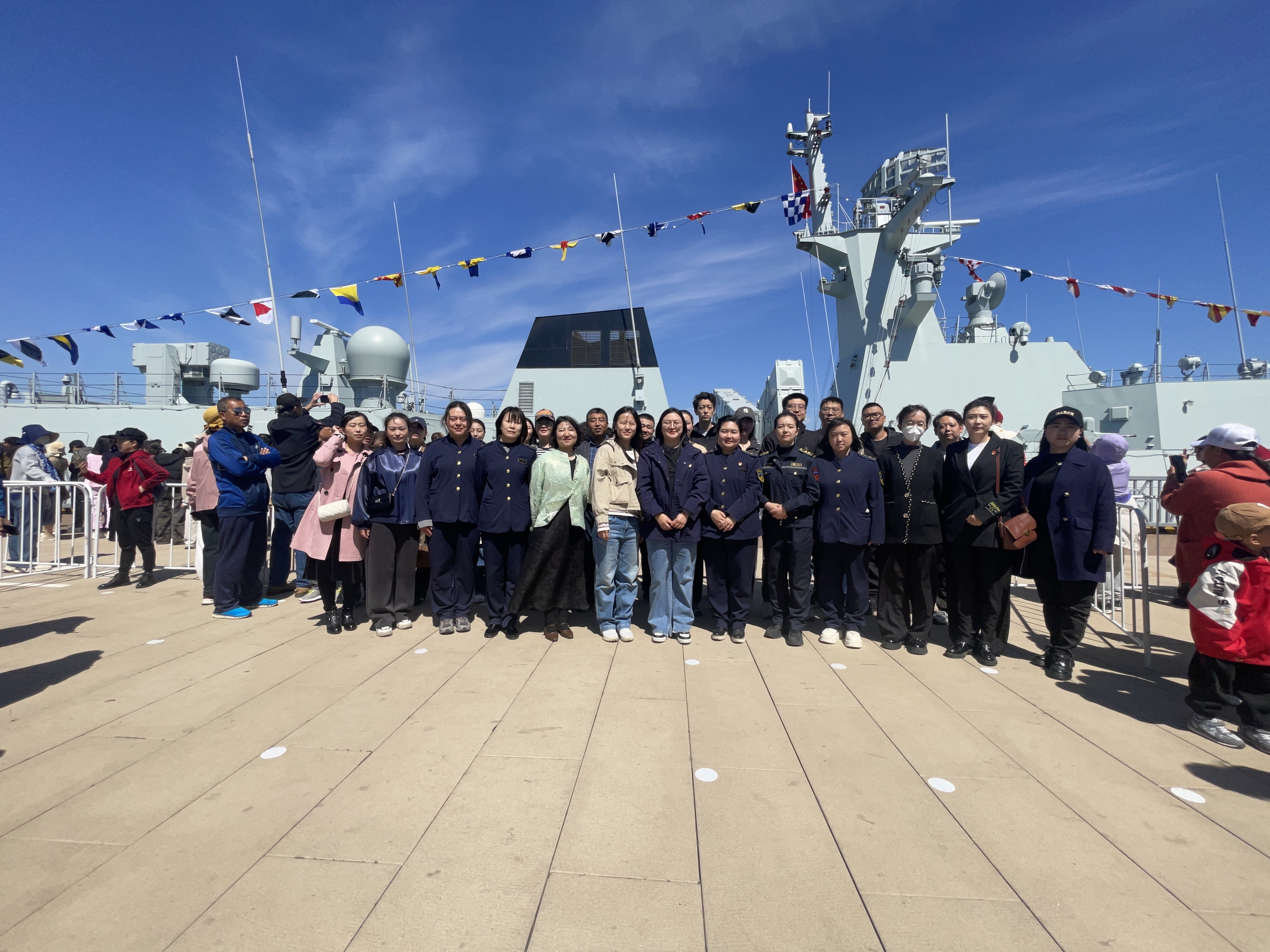 随后,大家来到了秦皇岛号导弹护卫舰停靠处,近距离参观先进的武器装备,听海军官兵讲述舰艇执行任务时的惊险故事,亲身领略我国海军的强大实力与风采。官兵们还热情地现场展示并传授旗语、绳结等海军特色技能,让团员及青年干部职工沉浸式体验海军文化,感受人民海军的独特魅力。
