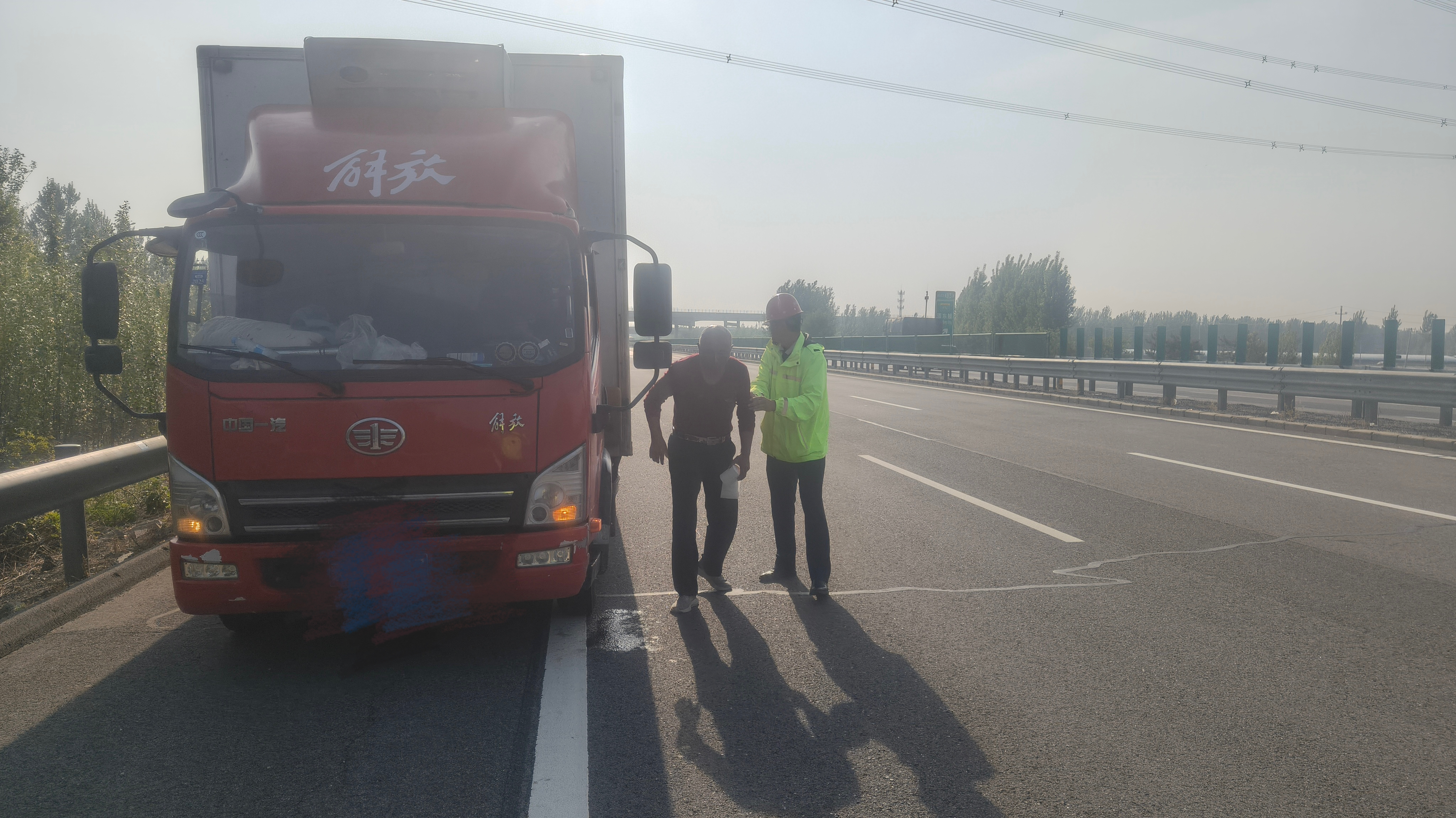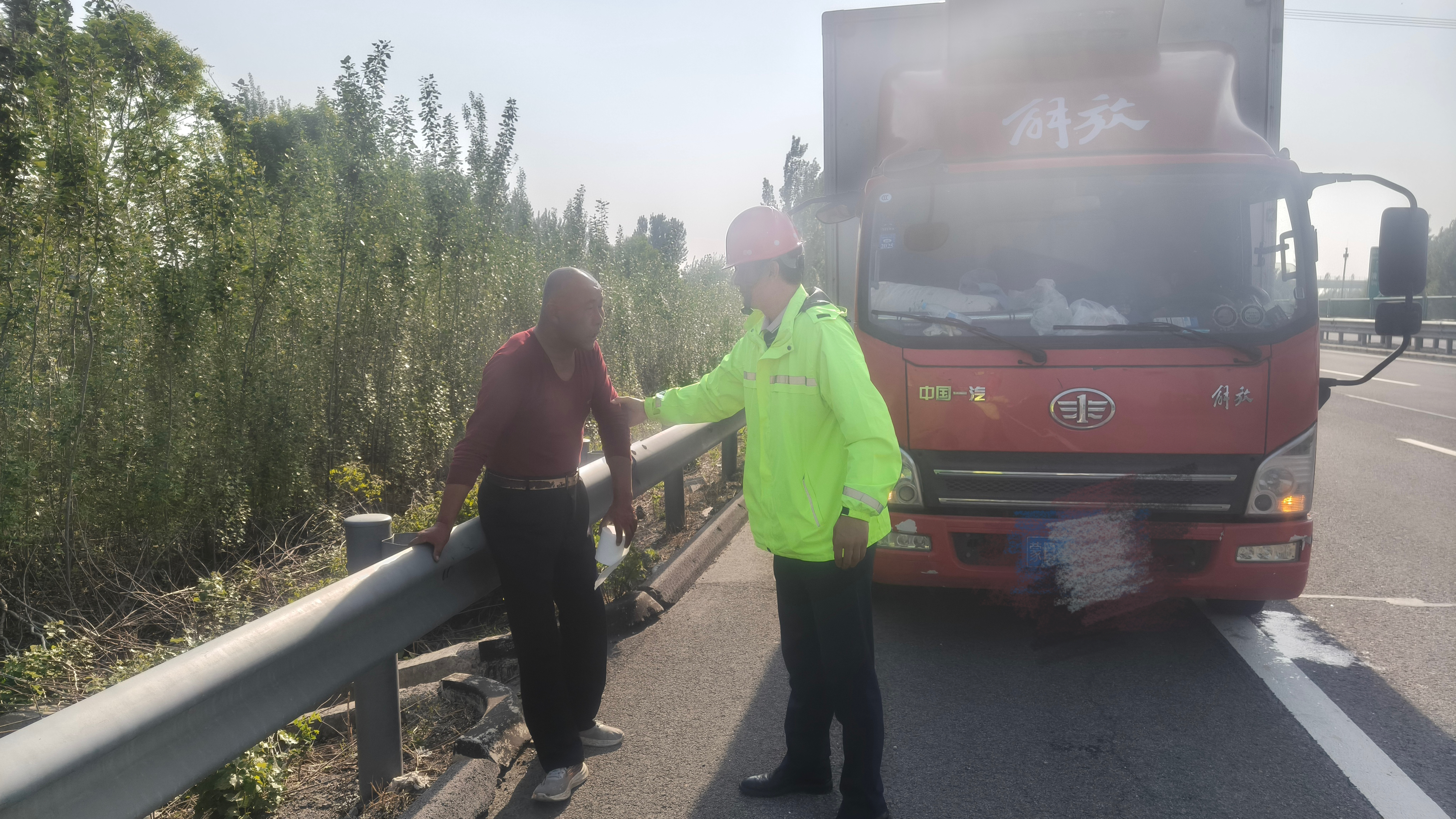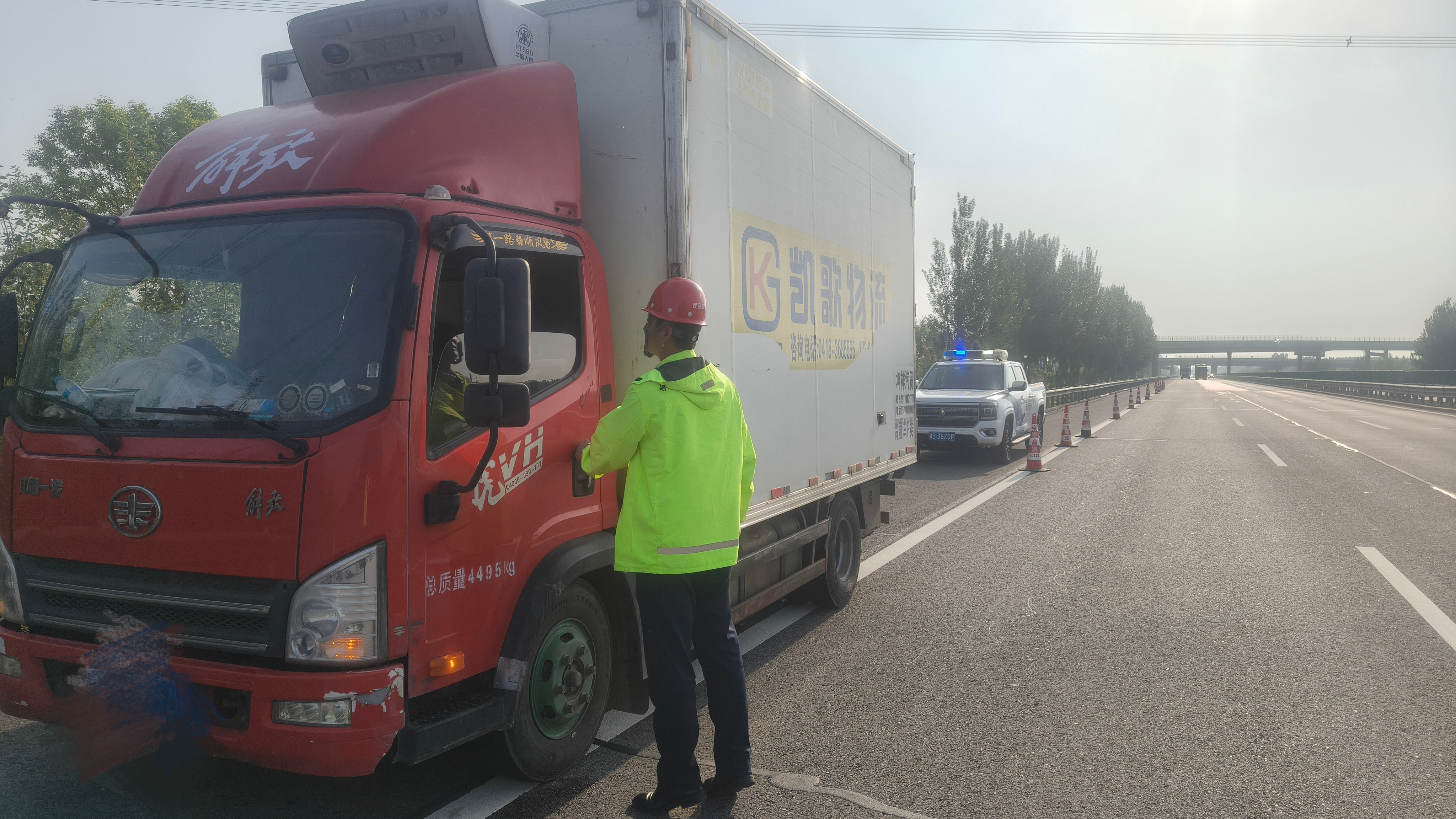 抵达现场后,救援人员迅速在货车后方设置警示标志,开启警示灯,并指挥引导过往车辆减速避让。随后,救援人员快步来到货车旁查看司机状况。只见司机面色苍白、满头大汗,表情痛苦,车旁地面有呕吐物。“师傅,别慌!我们是指挥调度中心的,一定会帮您!” 救援人员一边轻声安抚司机情绪,一边快速从车上拿来提前准备好的含糖饮料和食物。十几分钟后,司机的脸色慢慢恢复红润,精神状态也明显好转。考虑到司机身体刚刚恢复,继续驾驶存在安全隐患,指挥调度中心决定护送车辆驶离高速。最终,货车在救援人员的全程护送下,平安驶出高速。