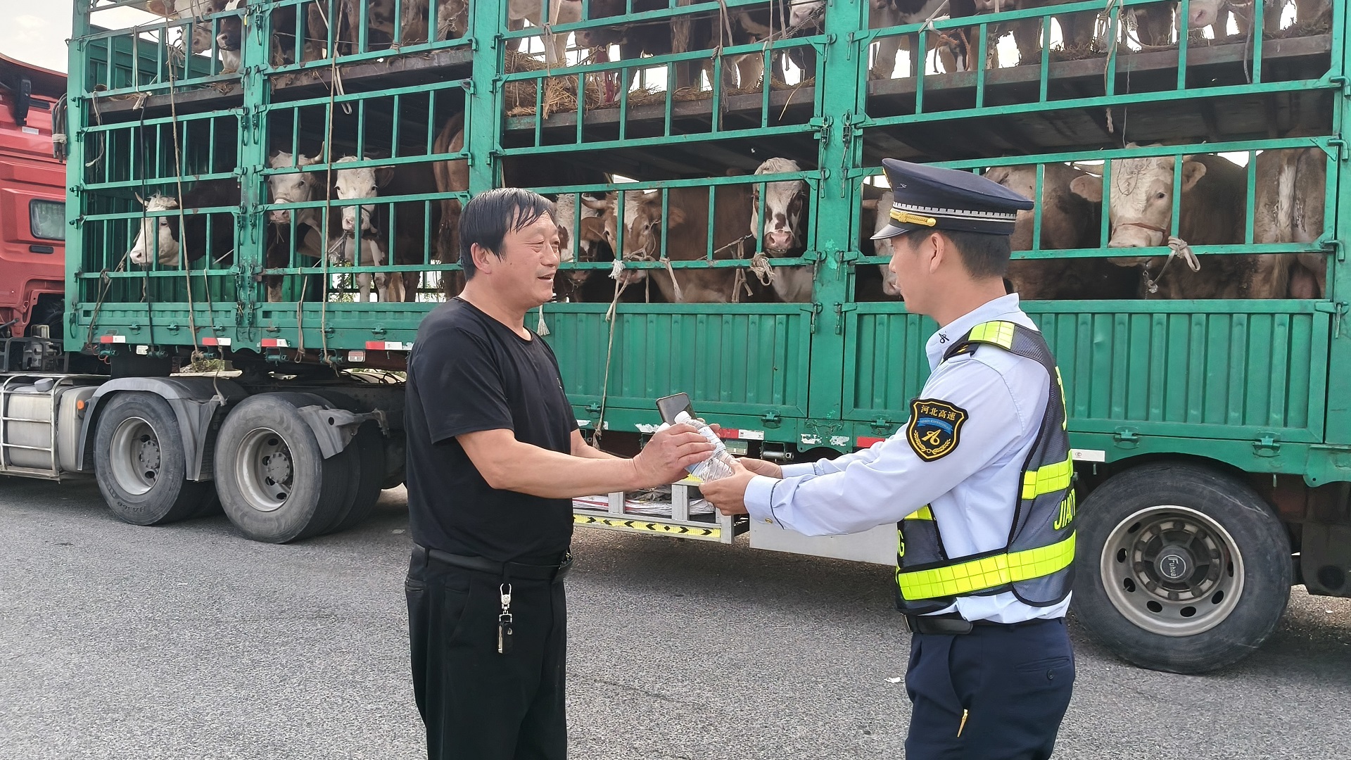 班长递上矿泉水立即安抚司机焦虑的情绪,第一时间与保通保畅大队取得联系,详细描述车牌特征及丢失路段,请求协助查找车牌;同时,凭借对周边环境的熟悉,为司机规划出最近的修车路线,并帮忙用手机导航指引。司机感动不已,紧紧握住班长的手说:“要不是你们,我这一车牛肯定晚点送到,谢谢你们,你们的帮助太及时了!”