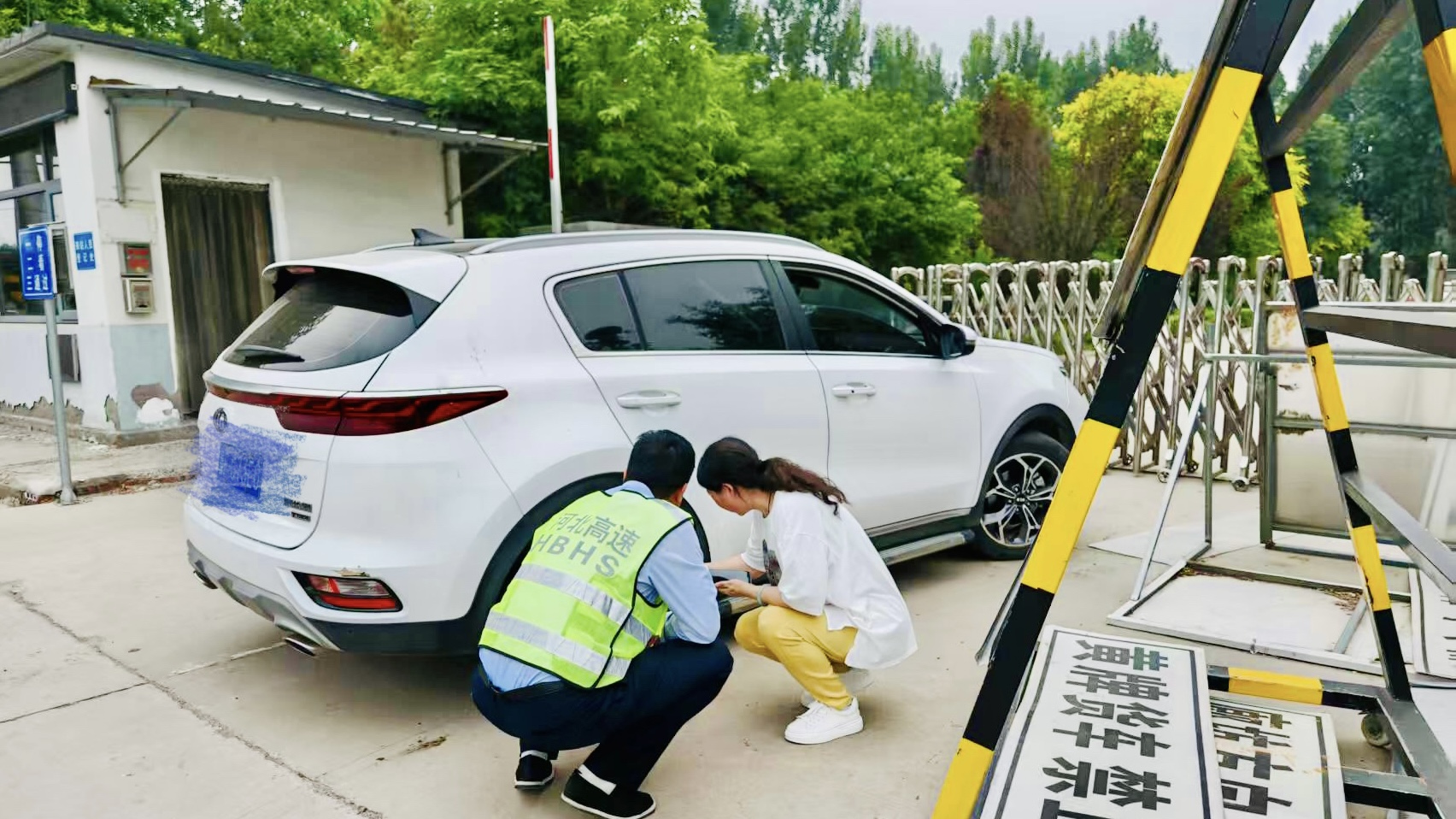 5月20日,在东湾收费站入口广场,一辆银色轿车缓缓停靠在路边,双闪灯随即亮起。年轻女司机神情慌张,不断张望,显得手足无措。班长看到后快步上前,敲了敲车窗。女司机连忙摇下车窗,告知班长车辆胎压报警灯亮了,轮胎欠压,不知该如何处理。班长一边安慰她,一边迅速从车里拿出三角警示牌,放置在车后方,做好安全防护措施。