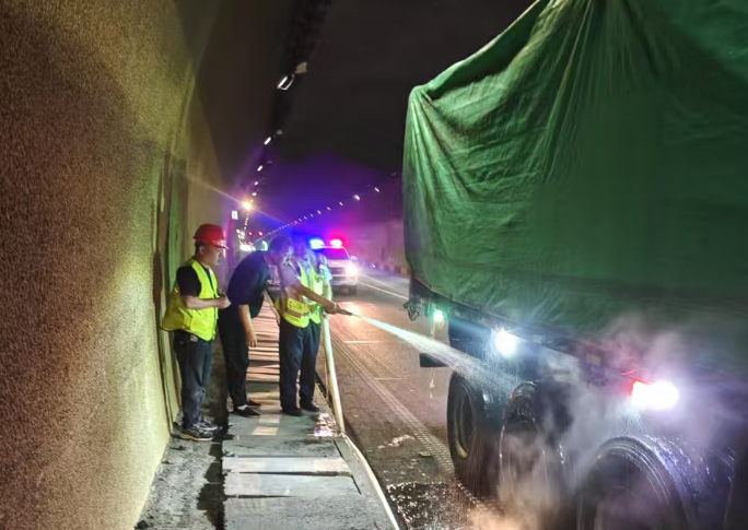 险情发生后,监控员第一时间将情况报告值班站长,并即刻启动应急预案,同时迅速向联合指挥调度中心、红旗保通保畅应急大队、高速交警等相关部门进行上报。为防止二次事故发生,监控员更改隧道情报板、车指器、交通信号灯,同步开启隧道内应急广播,试图与受困司乘取得联系。另一边,值班站长接到报告后,迅速组织机电人员奔赴事发现场。15点31分,隧道站长和机电人员抵达现场,立即启用水消防设施展开灭火工作。经过紧张扑救,15时37分,明火被成功扑灭,现场局势得到有效控制。随后,相关人员继续有条不紊地开展事故现场清理工作,直至17时25分,道路恢复正常通行。