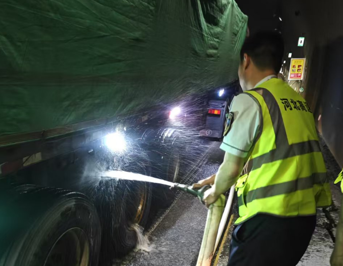 5月26日下午15点20分,红旗隧道管理站监控员在例行视频巡查时,发现小三岔口隧道承德方向有一辆大货车停在行车道上。监控员立即仔细确认,发现车辆轮胎部位出现明火,火势有蔓延的趋势。监控员立即启动突发事件应急预案,各岗位人员迅速响应、协调联动,最终及时处置化险为夷。