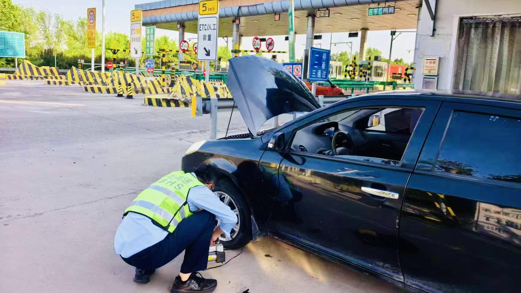 5月25日下午,一辆小轿车驶入东湾收费站入口广场,突然减速停在原地并亮起双闪警示灯。工作人员上前询问后得知,该车前轮胎已经完全亏气,无法正常行驶。