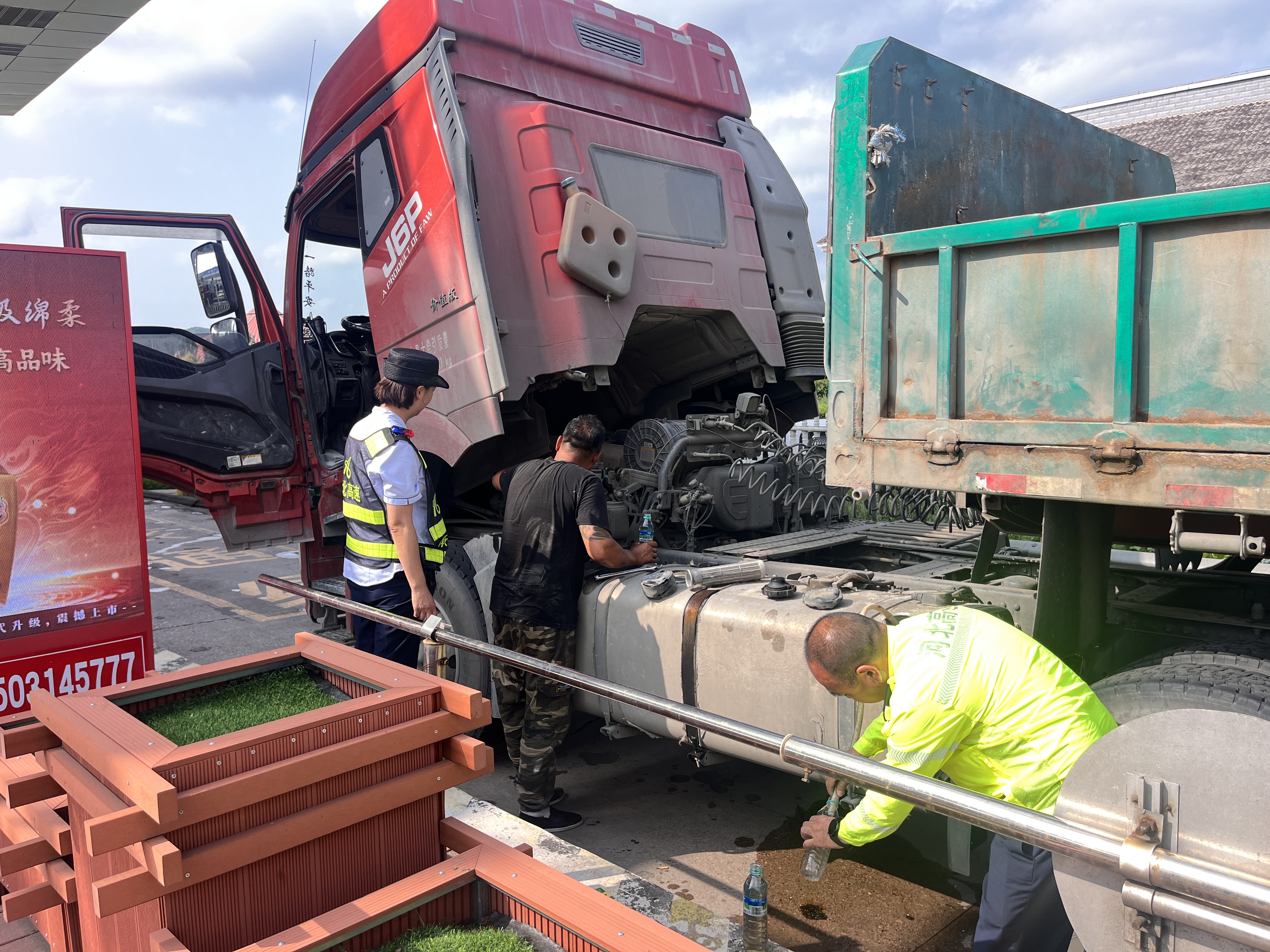面对这一突发状况,值班站长罗延武迅速反应,第一时间了解情况。在确认货车是因油泵故障导致无法启动后,毫不犹豫地伸出援手。他一边通知班长加开车道,一边协助司机将油箱中的油通过临时准备的短管接到瓶中,再小心翼翼地倒入油泵中。经过一番紧张而有序的操作,货车终于成功恢复启动,顺利驶离了双峰寺收费站车道。