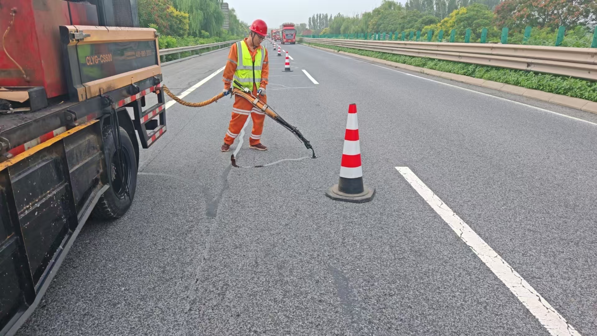 三是持续推进路面灌缝。为预防路面裂缝进一步发展,延长道路使用寿命,分中心持续推进路面灌缝作业。养护人员操作专业设备,仔细清理裂缝中的杂物,然后注入密封胶材料,有效阻止雨水渗入路基,保护路面结构。