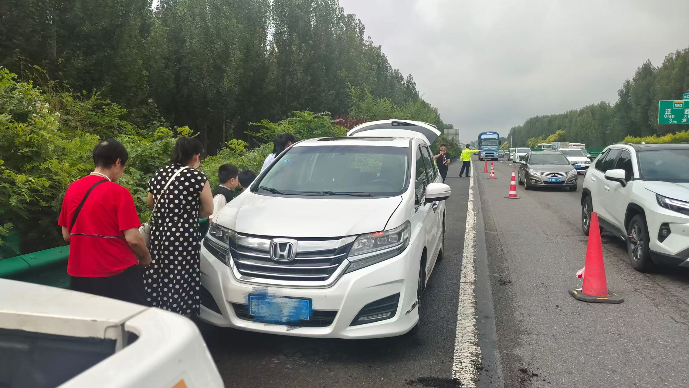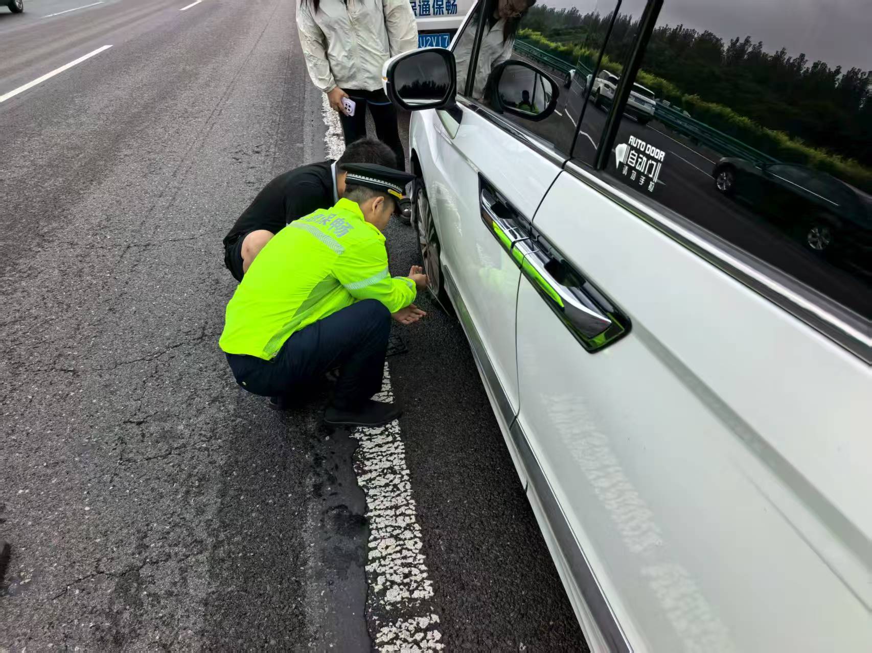 8月16日9时10分,唐山保通保畅应急大队队员周泽山、胡明明巡逻至京哈高速沈阳方向K169公里处,发现一辆白色本田商务车停靠在应急车道。走近一看,发现车辆左前轮爆胎,车上还有老人、小孩一行七人。恰逢周末,路面车流量大,驾驶员满脸焦急,不知如何是好。