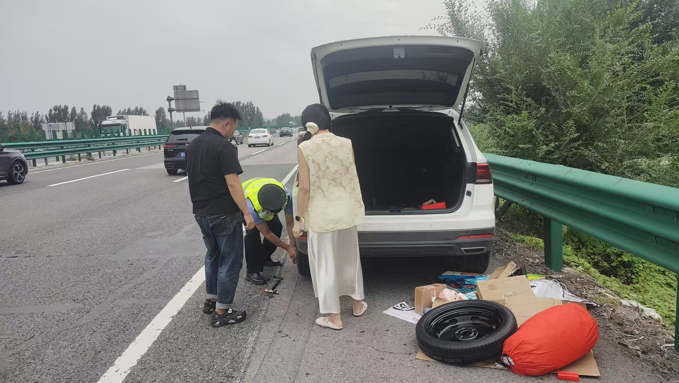 15时20分,队员周泽山、胡明明巡逻至京哈高速沈阳方向K161公里处,发现一辆白色大众车停靠在应急车道,发现车辆左后轮爆胎,此处正是唐津高速与京哈高速交汇处,路面车流量大,驾驶员满脸焦急,不知如何是好。