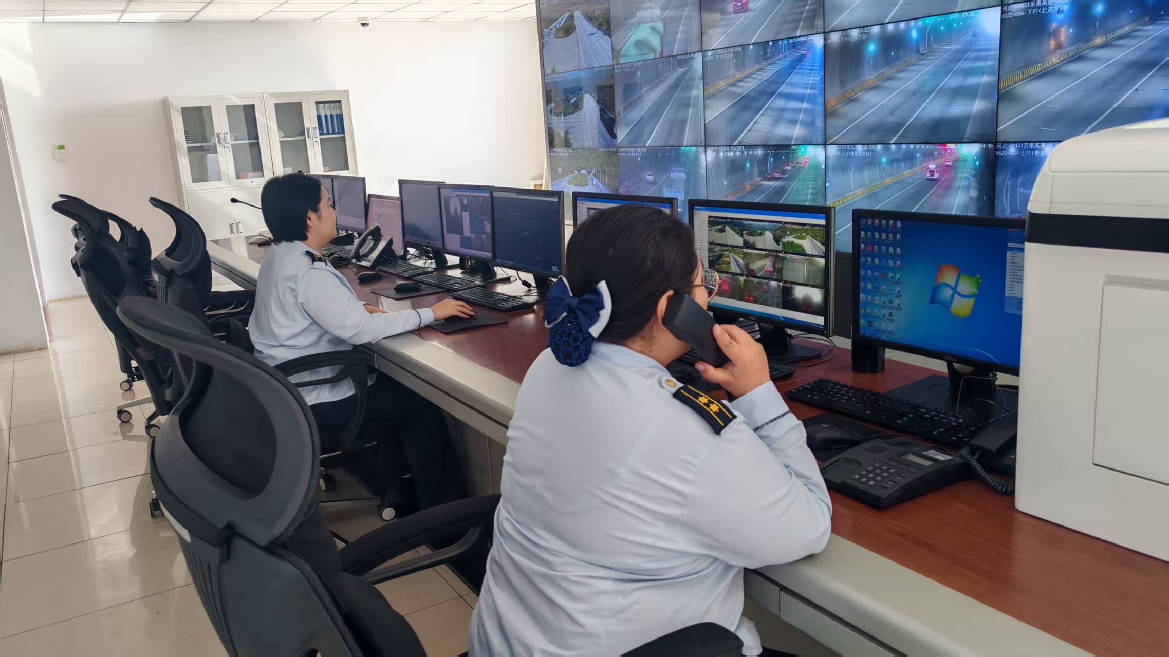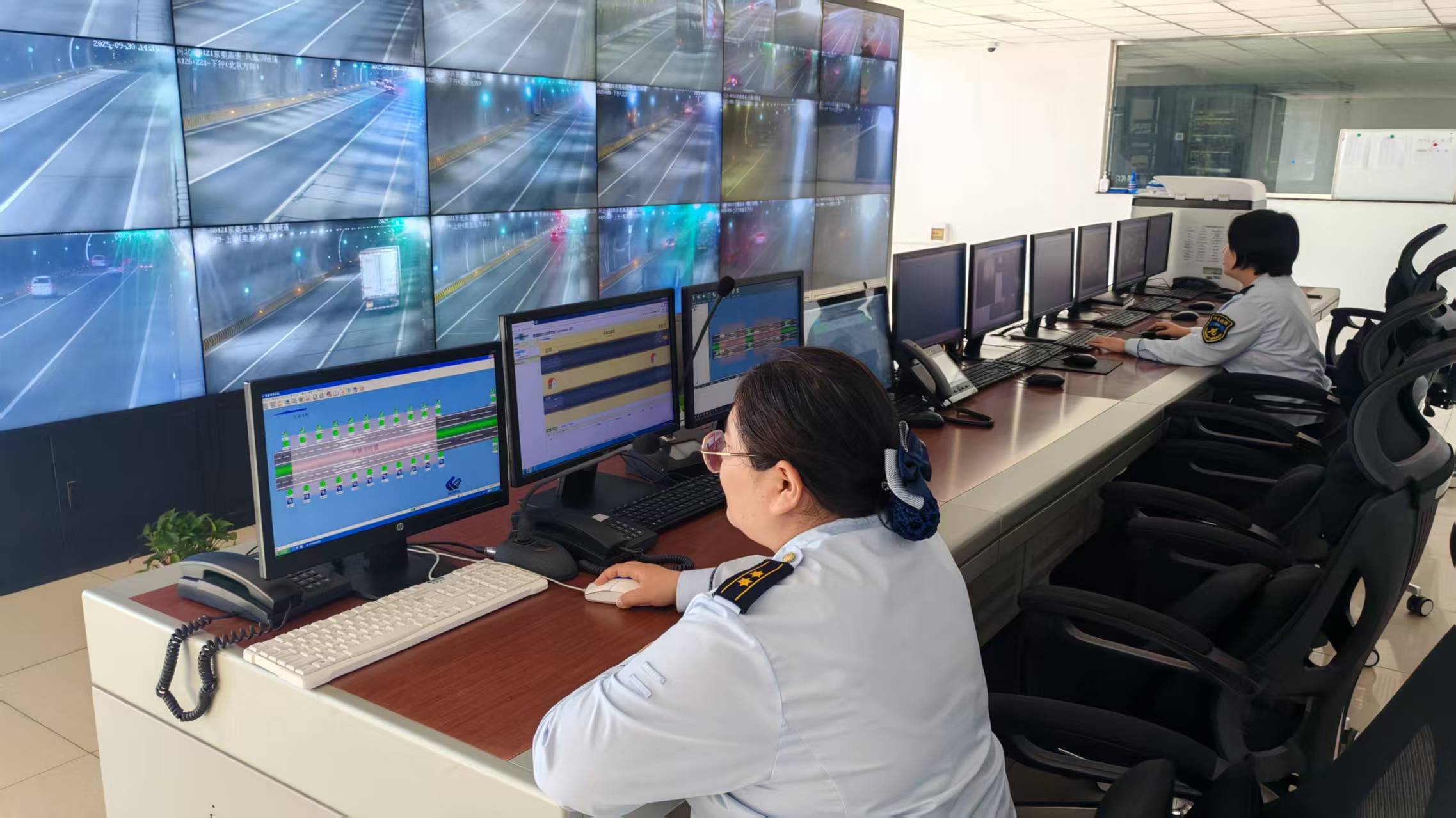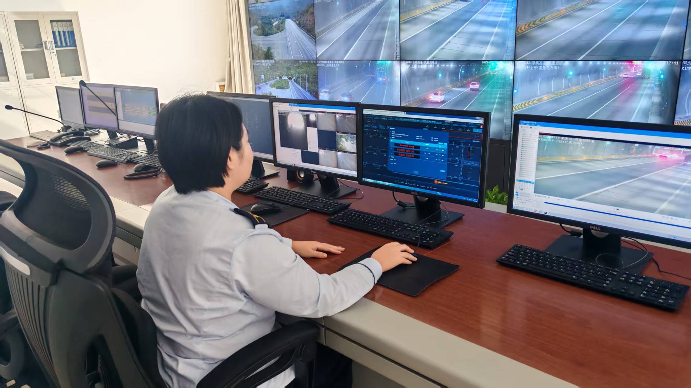 9时08分,隧道监控员在视频巡查中第一时间发现这一突发情况,立即按照隧道突发事件应急处置流程进行处置,一名监控员迅速更改隧道入口情报板发布警示信息,切换车道指示灯及交通信号灯引导车辆避让,并开启隧道广播循环播报险情,为过往车辆构建起多层级安全预警网,有效遏制次生事故发生。另一名监控员同步报告分公司指挥调度中心(保通保畅应急中心)、保通保畅大队、值班站长,通过险情信息“快传快达”,为现场处置争取黄金时间。