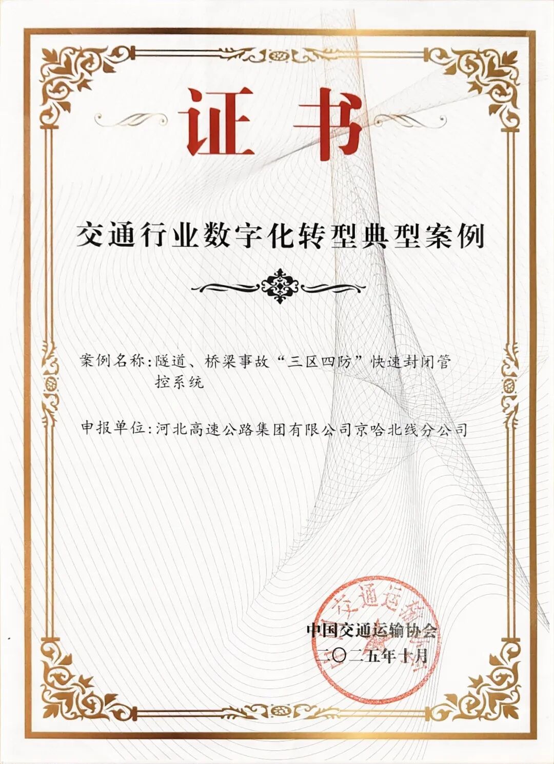 近日,京哈北线分公司自主研发的“隧道、桥梁事故‘三区四防’快速封闭管控系统”成功获评“2025交通行业数字化转型典型案例”。全国共有72个案例获此荣誉,京哈北线分公司是河北高速集团有限公司所属子(分)公司中唯一一家获此殊荣的二级公司。