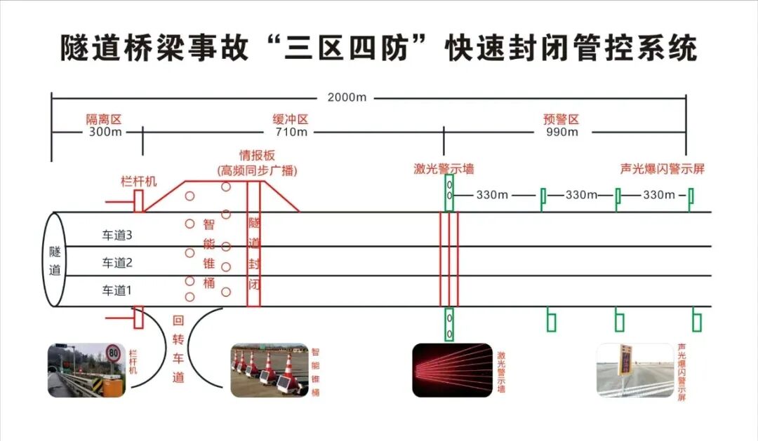 该管控系统旨在隧道桥梁中遇到交通事故、火灾等突发事件时,通过远程“一键启动”控制隧道口各类预警设备,及时高效对事故区域进行快速封闭,阻止后方车辆进入事故区域,防范遏制隧道、桥梁次生事故,最大程度减少人员伤亡和财产损失。