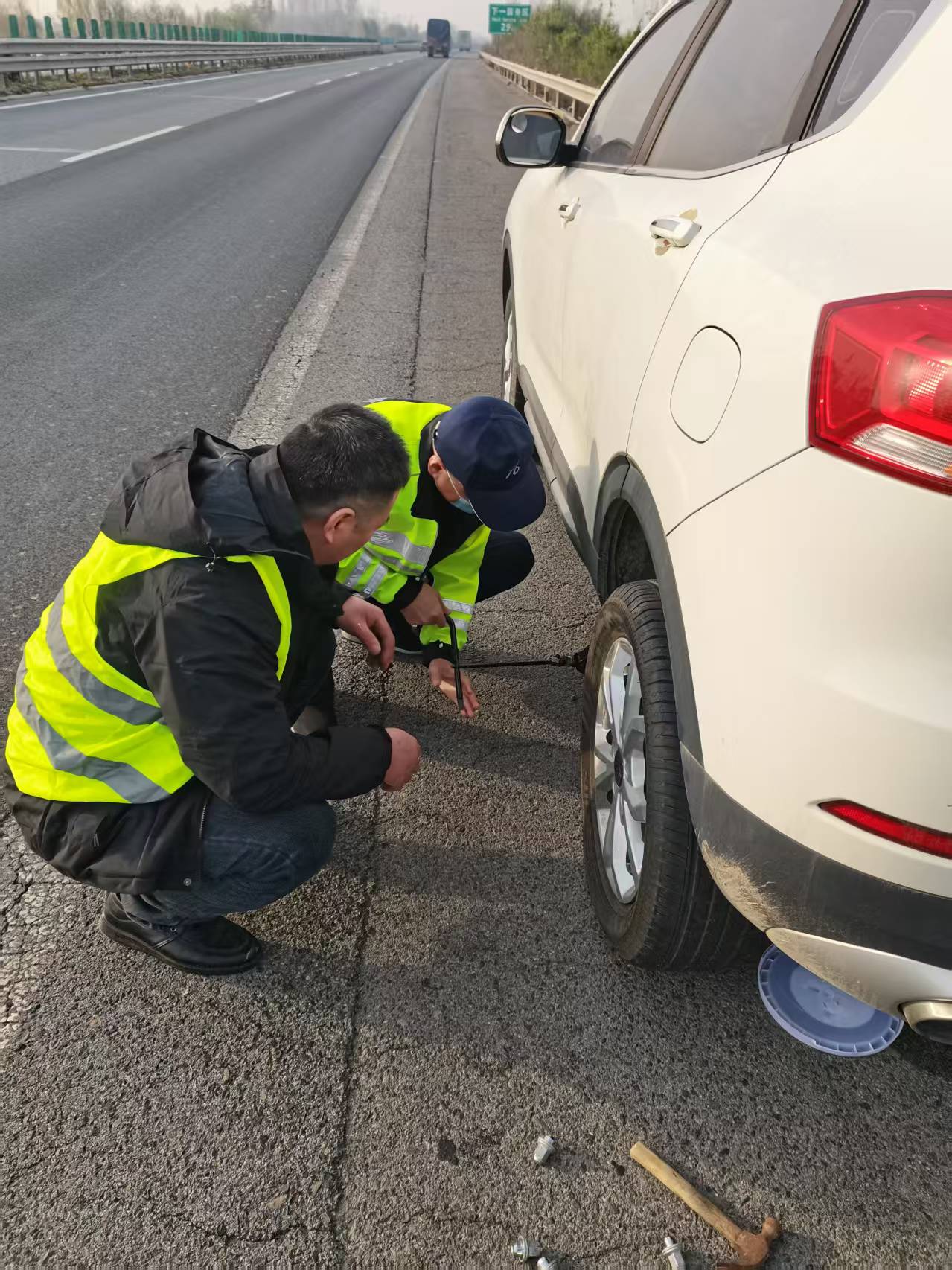 11月23日上午,京沪分公司东光保通保畅应急大队日常巡查至上海方向267+650路段时,发现一辆故障车辆停在应急车道,该车左后轮胎爆胎,司机盯着瘪掉的轮胎直皱眉。