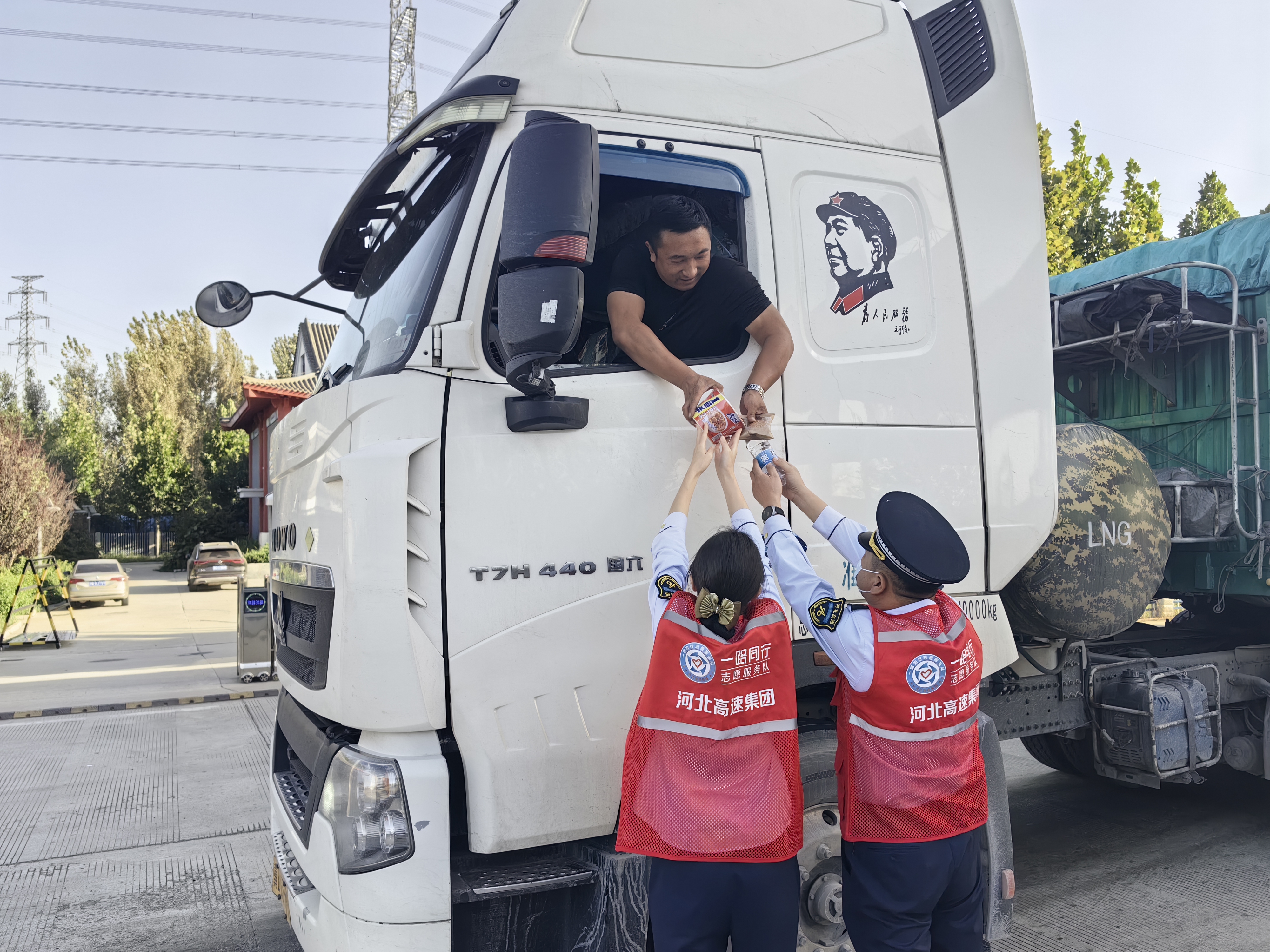 高官庄收费站组建“一路同行”志愿服务队,在收费站入口位置设立服务台,为返程救援人员免费提供食物、矿泉水和应急药品。(摄影:王芳 郑亚敬)